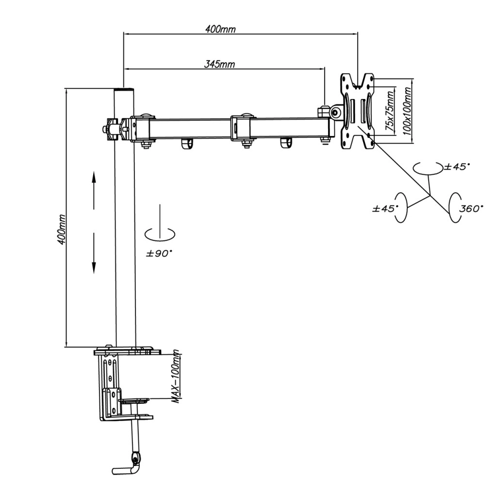 The mount supports tilt from -45° to +45° and rotation from -90° to +90°, so you can easily adapt the view to the task at hand. The integrated cable concealment keeps your desk clean and uncluttered.
