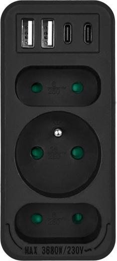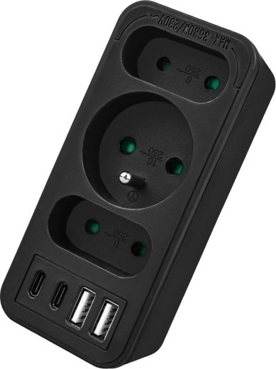 Socket splitter with 3 outlets and USB-A/USB-C, black