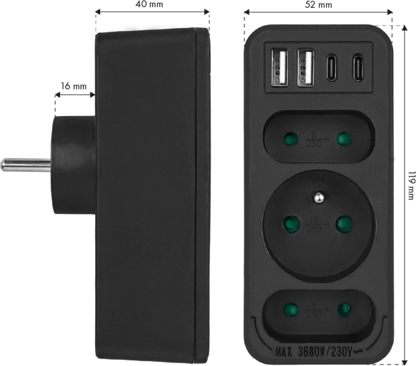 A practical plug-in socket splitter combining three power outlets and four USB ports offers universal power for home and office. Two flat sockets and one grounded socket handle both small electronics and higher-power appliances, while 2× USB-A (up to 18 W) and 2× USB-C with Power Delivery (up to 20 W) enable fast and safe charging for phones, tablets, and accessories—all in one place.