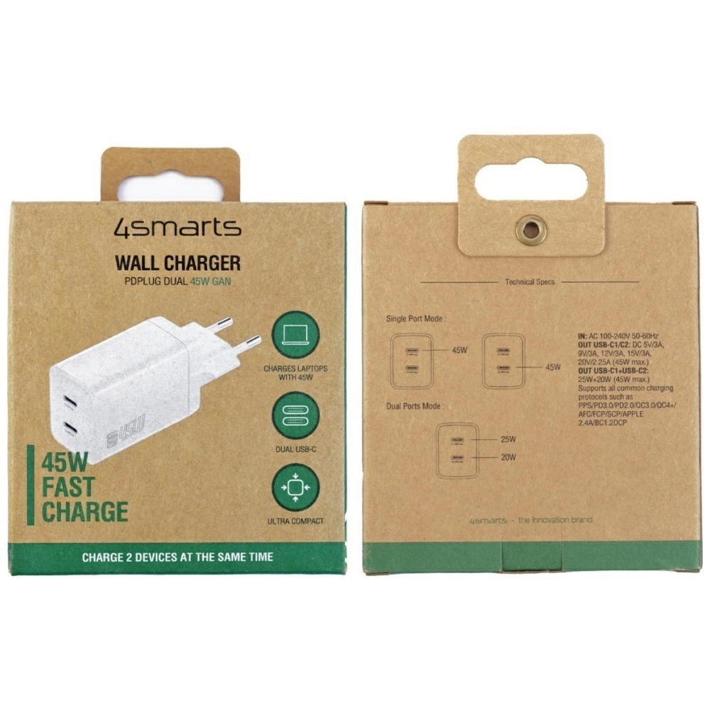 Modern GaN reduces size, lowers heat, and increases efficiency. Get 45 W of power in a lightweight, space‑saving charger with an EU plug.