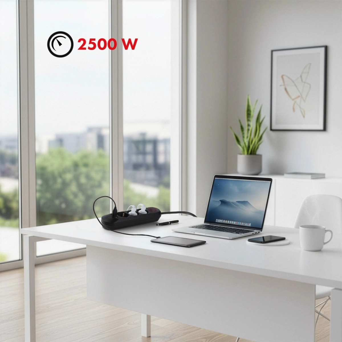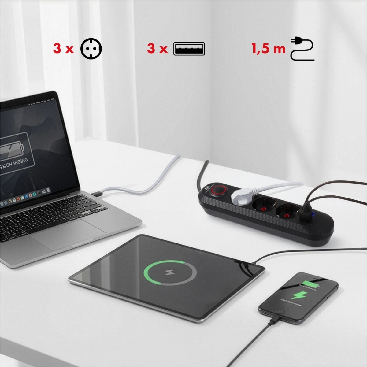 Tidy up your cables and power everything you need from one place. This power strip with 3 AC outlets and 3 USB ports conveniently handles a laptop, lamp, and charging your phone or tablet. Thanks to the universal input 110–240 V AC / 50–60 Hz and up to 2500 W output, it reliably manages daily operation.