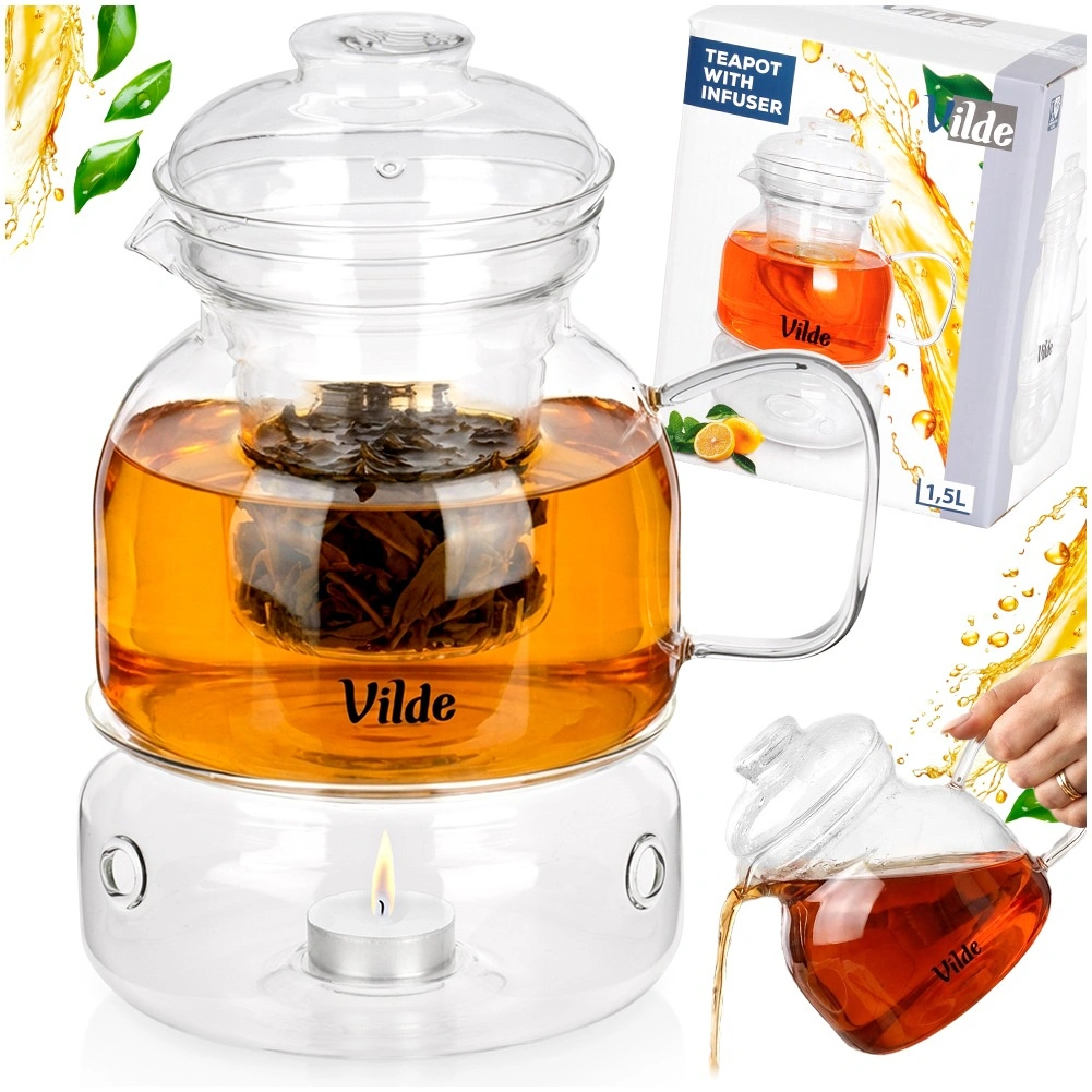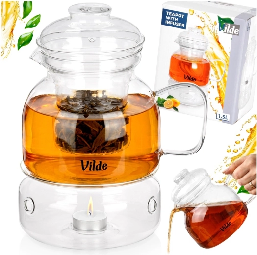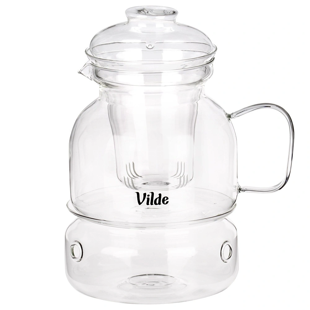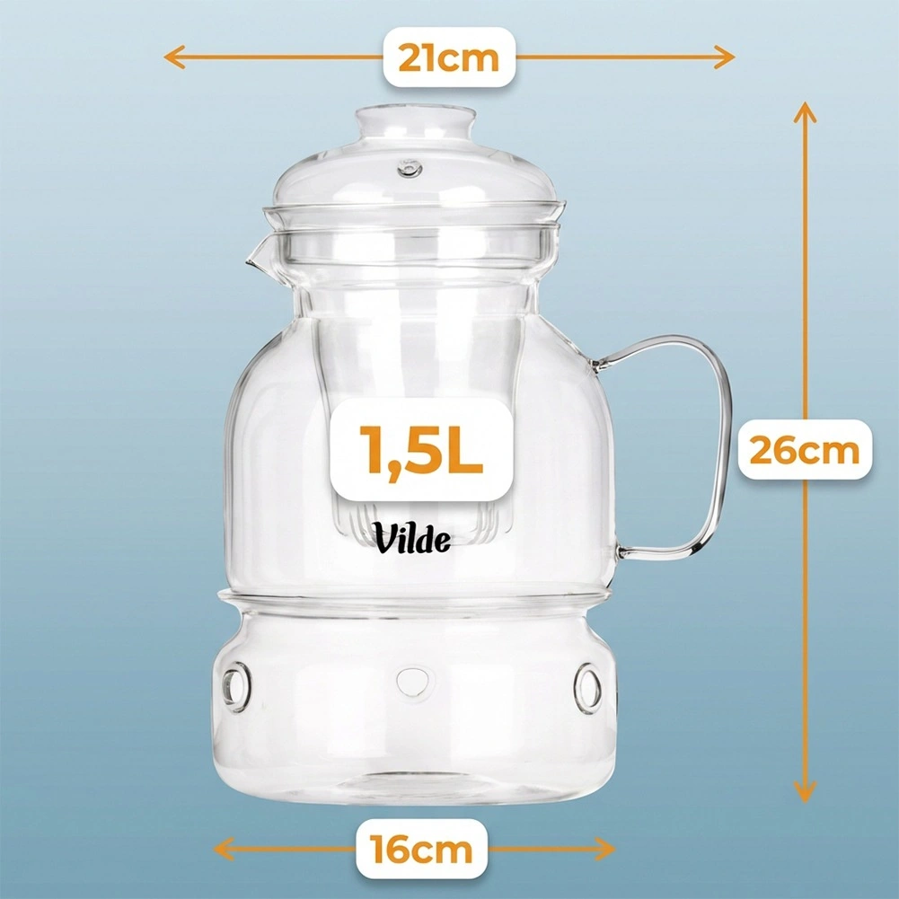 The entire set – teapot, filter, and warmer – is made of heat-resistant borosilicate glass, durable from -20 °C to 150 °C. Great for hot and cold beverages.