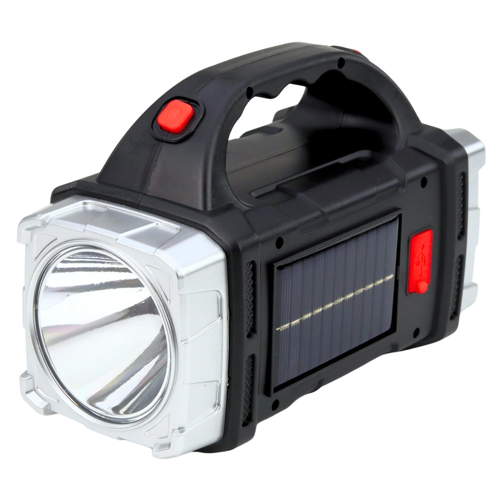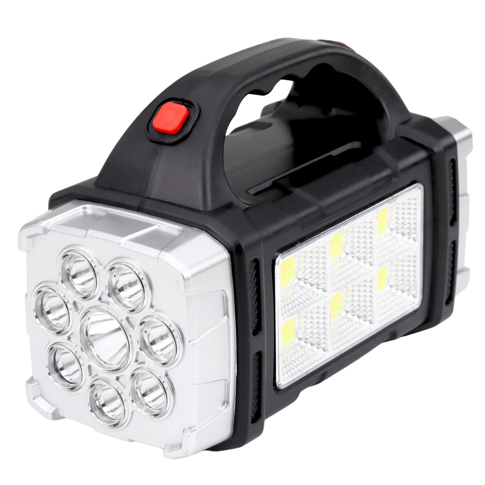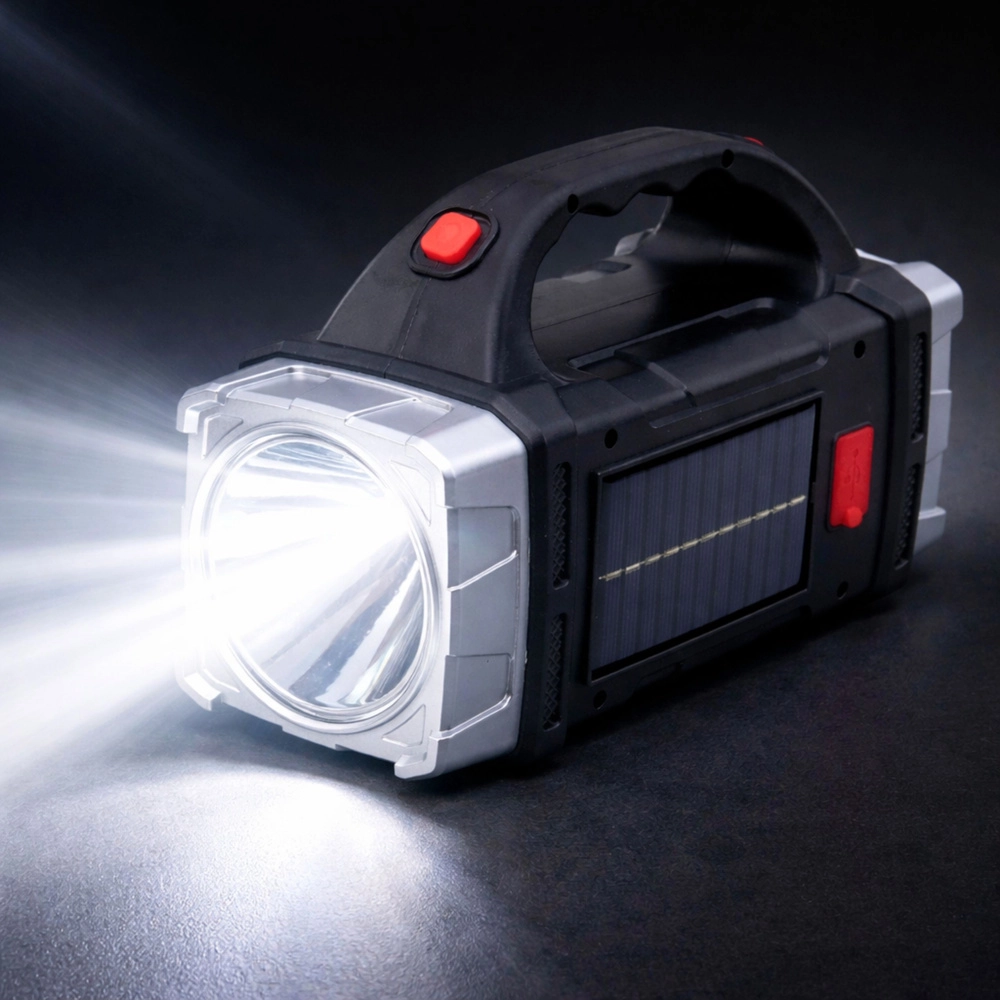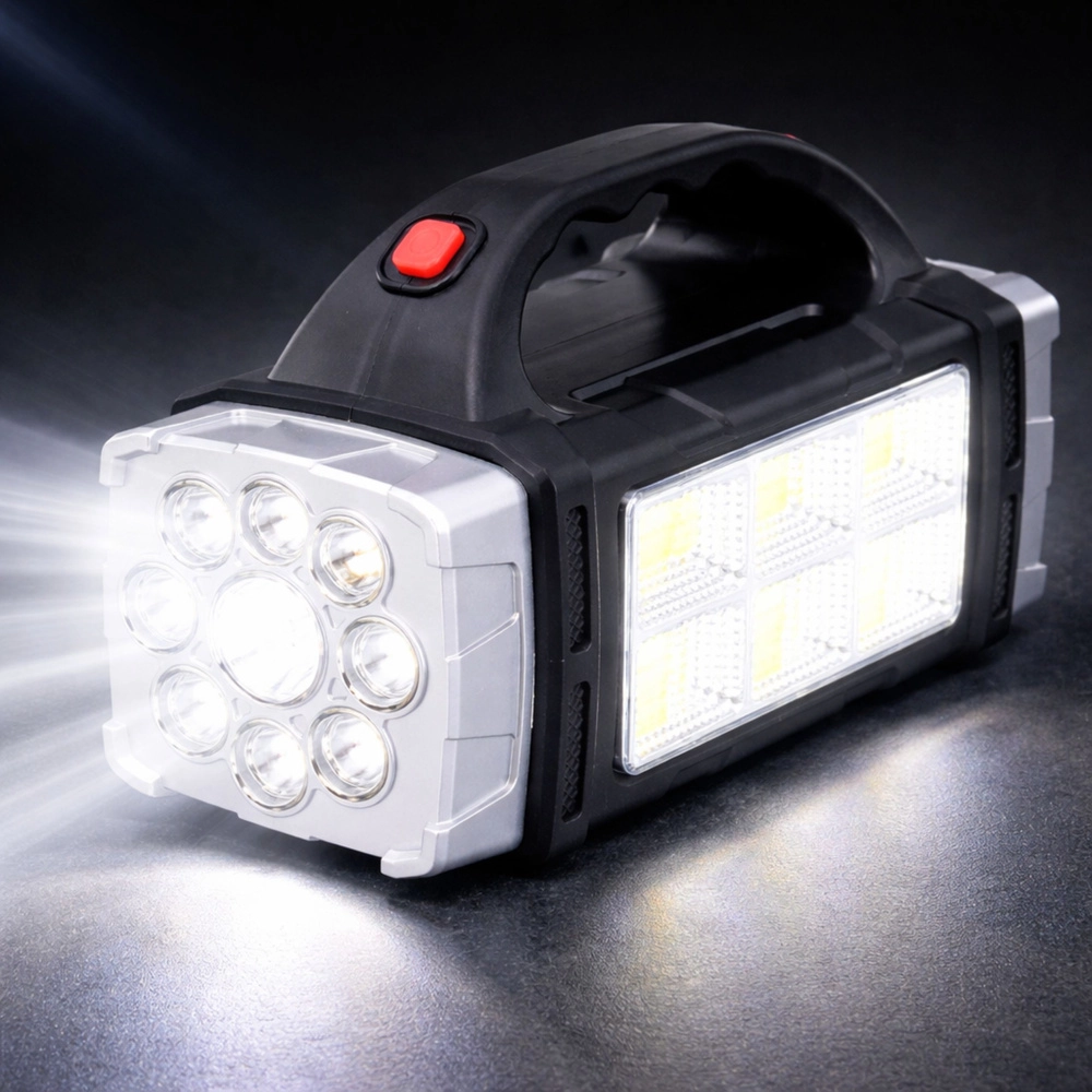 This solar multifunctional flashlight combines a powerful spotlight for long throw with a side COB panel for wide-area work lighting. The ergonomic handle and compact size make it easy to carry and use daily in the workshop, garage, garden, or on trips.