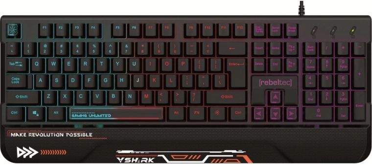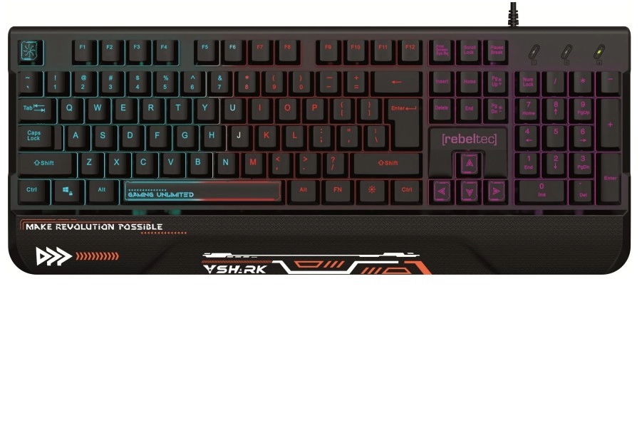 Meet the REBELTEC SHARK keyboard— a reliable tool for gamers and demanding users. The integrated wrist rest reduces fatigue during long sessions, while the water-resistant construction with fluid drainage channels protects the keyboard from accidental spills. Striking RGB backlighting improves visibility in the dark and adds a modern look to your desk.