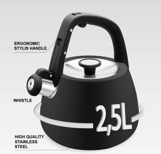 Stylish and durable MAESTRO kettle with a capacity of 2.5 l made of stainless steel, ideal for everyday boiling for tea and coffee. The whistling spout cap safely alerts you when the water boils, the multi-layer capsule base ensures fast and even heating, and the easy-to-remove lid makes filling and cleaning simple. Suitable for all types of stoves including induction.