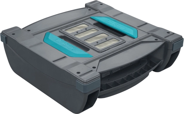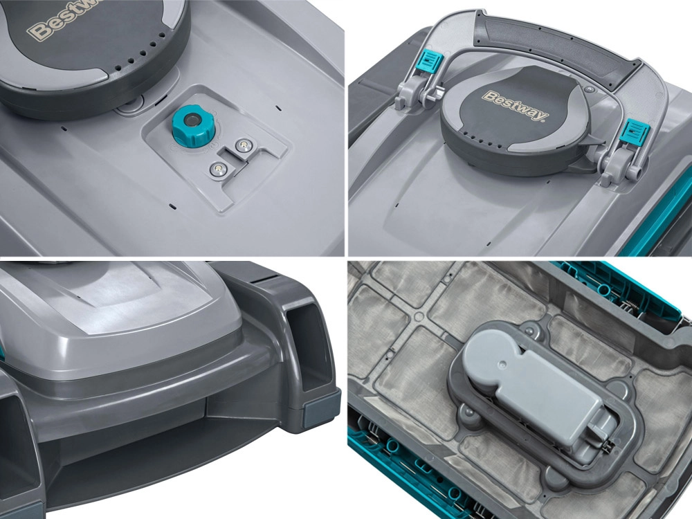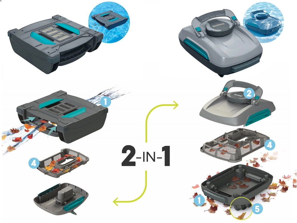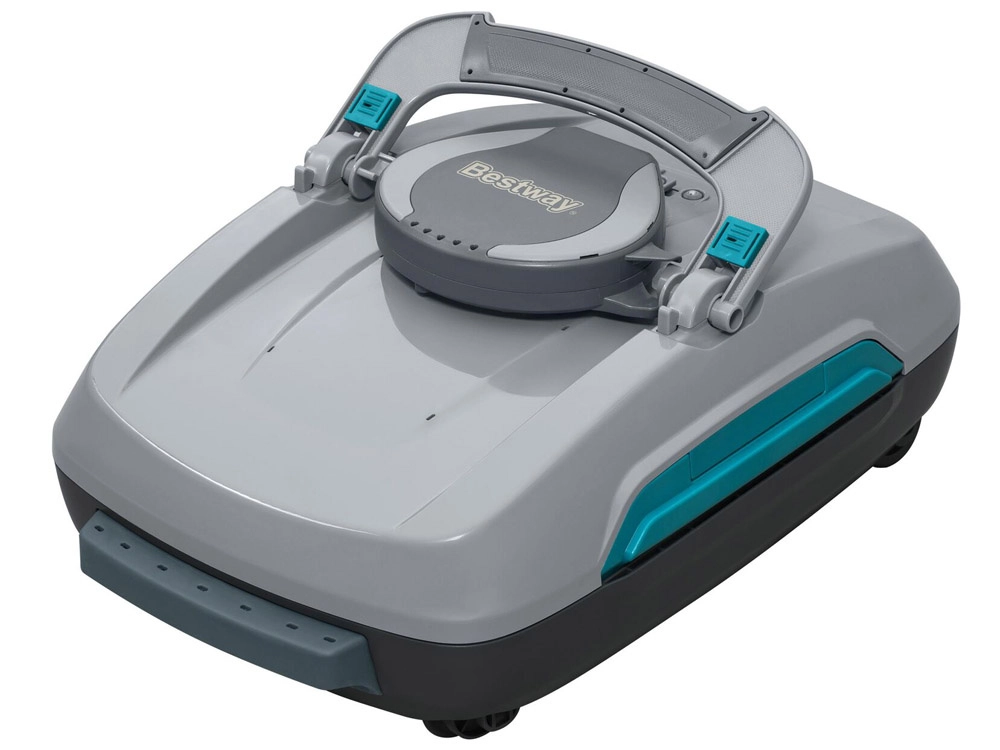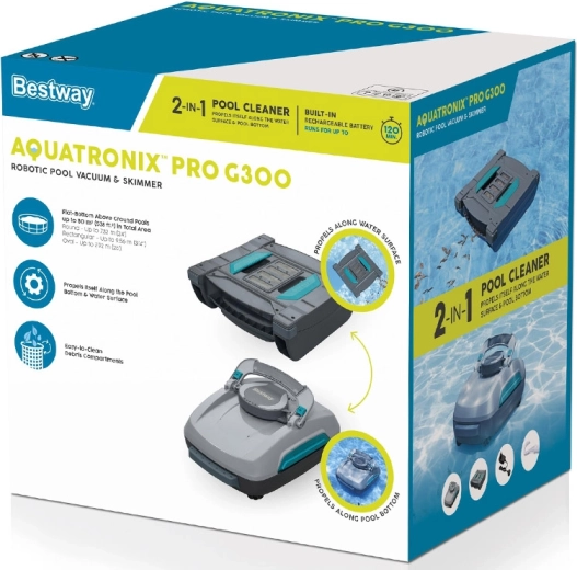 BESTWAY Aquatronix Pro G300 is a modern, fully automatic cordless 2-in-1 robot that cleans the pool floor and the water surface. Thanks to the built-in battery, it works for up to 120 minutes with no tangled cables. Large debris baskets (3.5 l for the floor and 6 l for the surface) and smart sensors for automatic start/stop ensure convenient, safe, and efficient maintenance, especially for above-ground pools with flat bottoms.