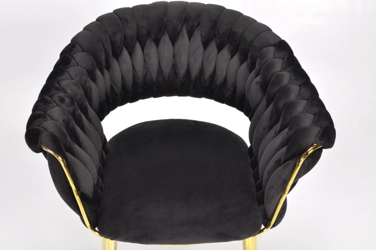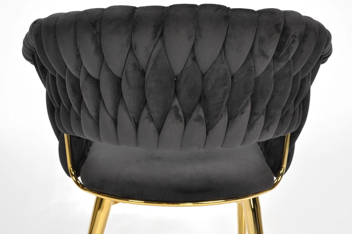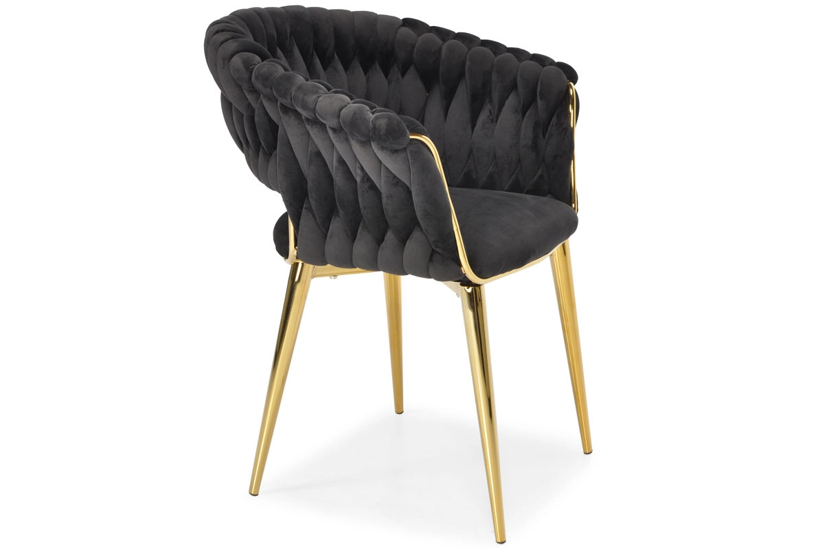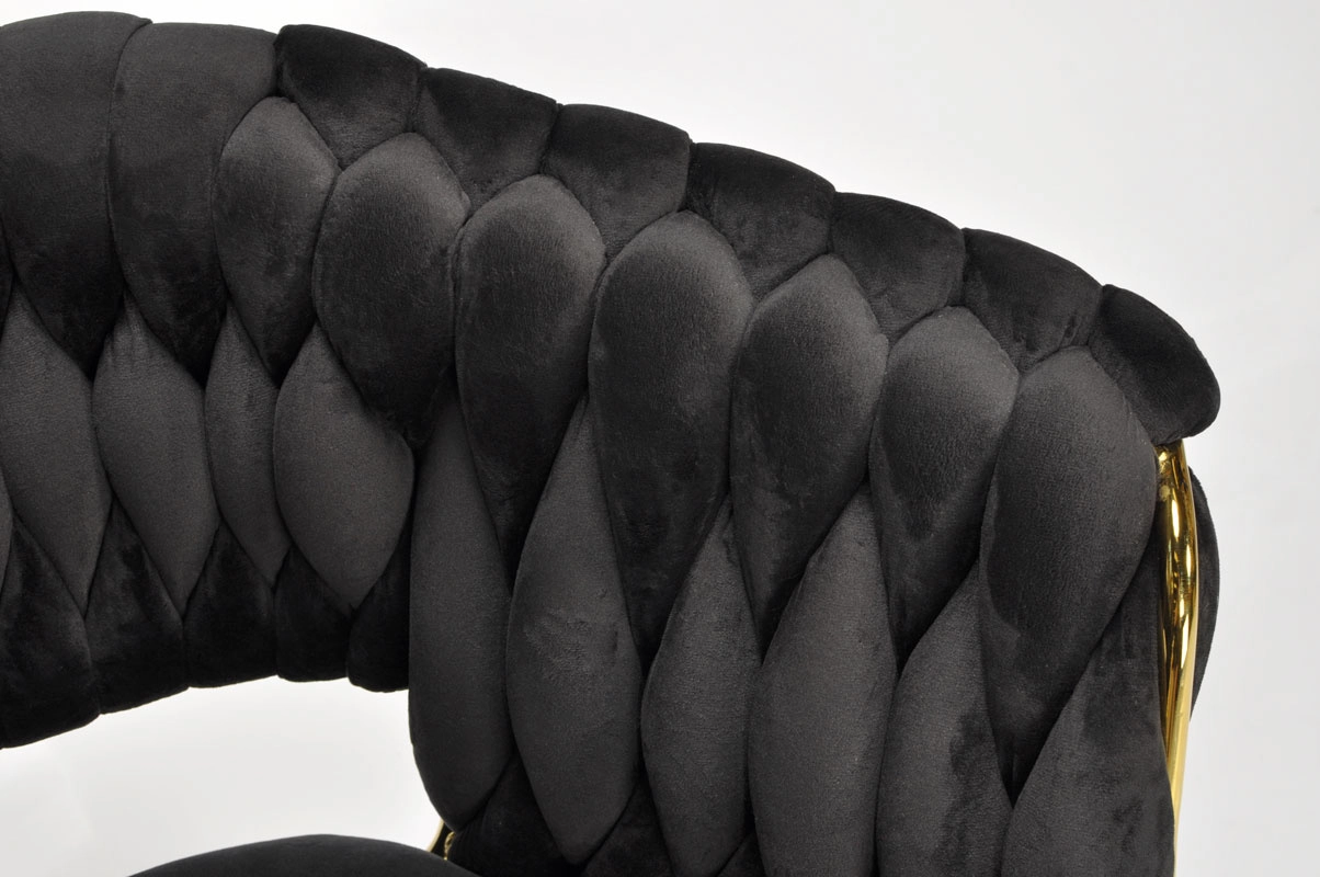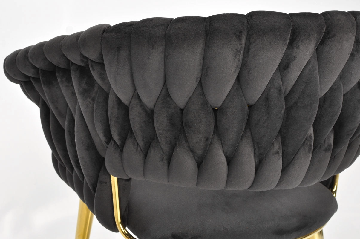 This modern velvet chair combines timeless black with gold accents for maximum impact. The velour upholstery is soft to the touch with a gentle sheen, making it perfect for the dining room, living room, or a stylish café. The braided backrest adds decorative character, turning the chair into a compelling statement piece.