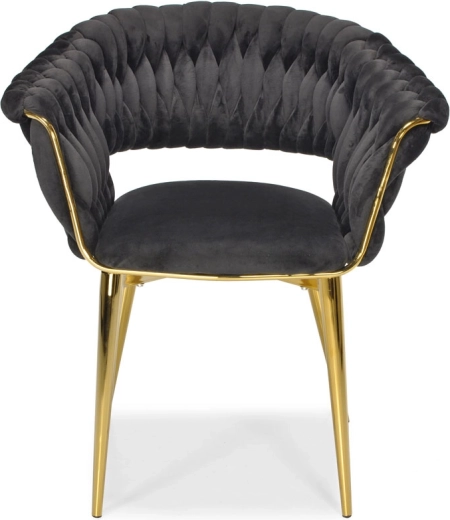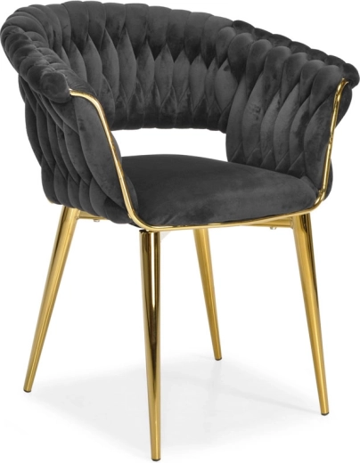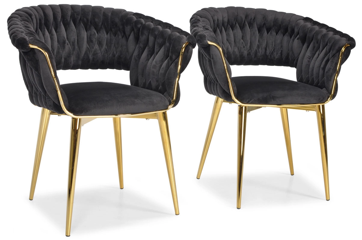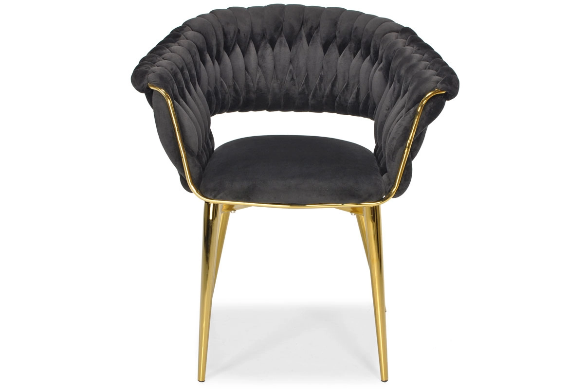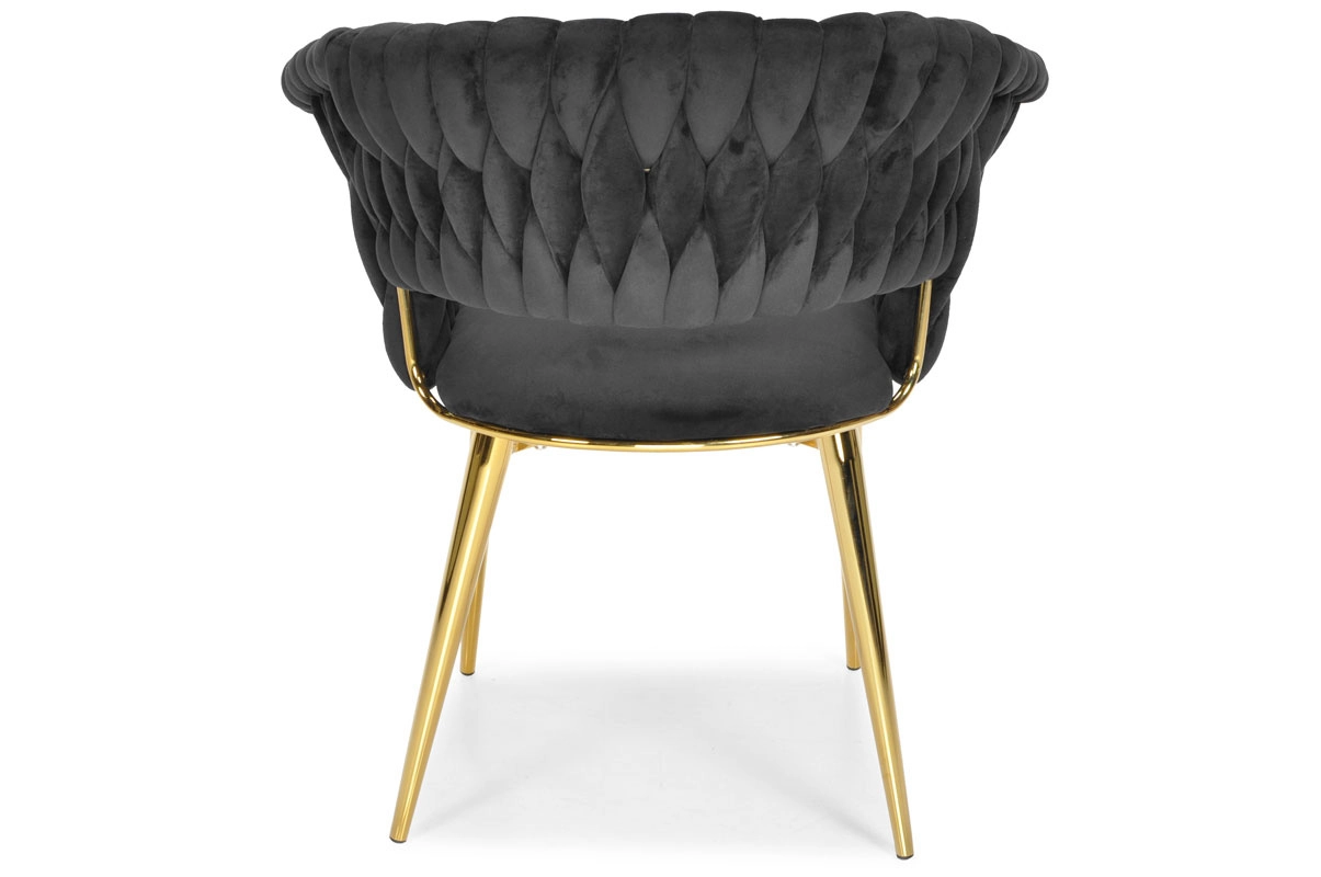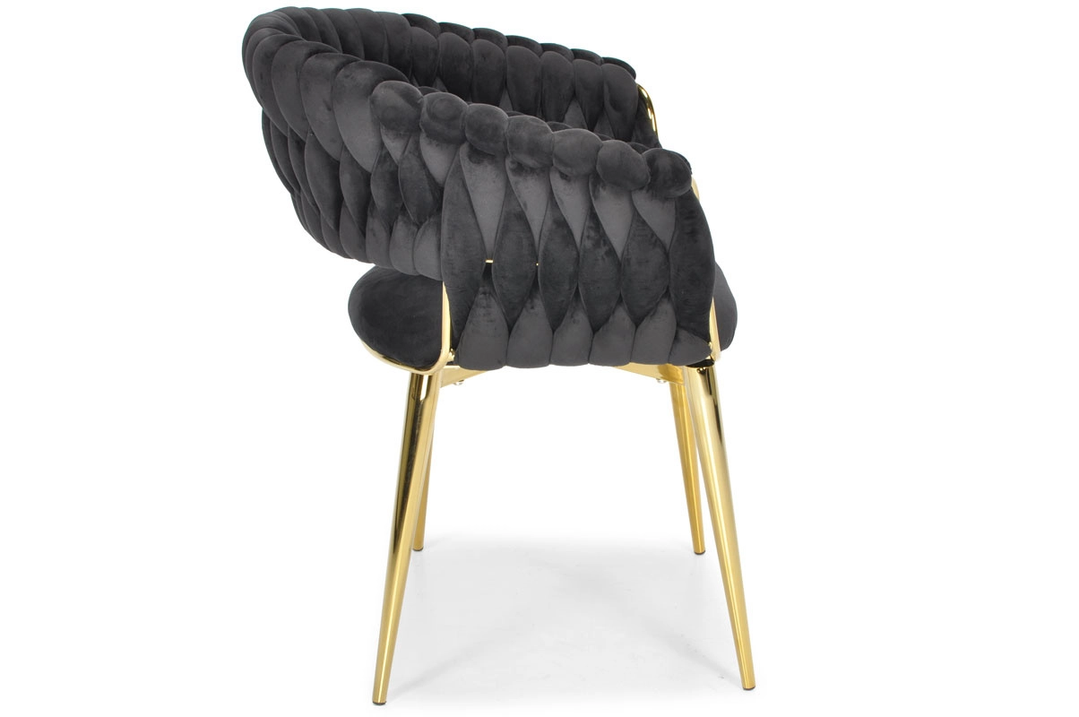 This modern velvet chair combines timeless black with gold accents for maximum impact. The velour upholstery is soft to the touch with a gentle sheen, making it perfect for the dining room, living room, or a stylish café. The braided backrest adds decorative character, turning the chair into a compelling statement piece.