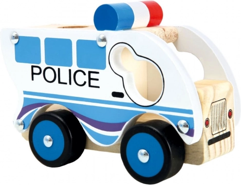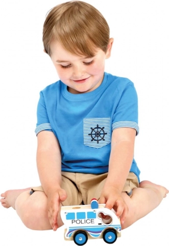 This wooden police car in a white-and-blue design is an ideal first vehicle for children from 1 year. Thanks to sturdy construction from thick plywood and solid wood, it withstands everyday play, while the rotating wheels ensure smooth rides on carpet and hard floors.