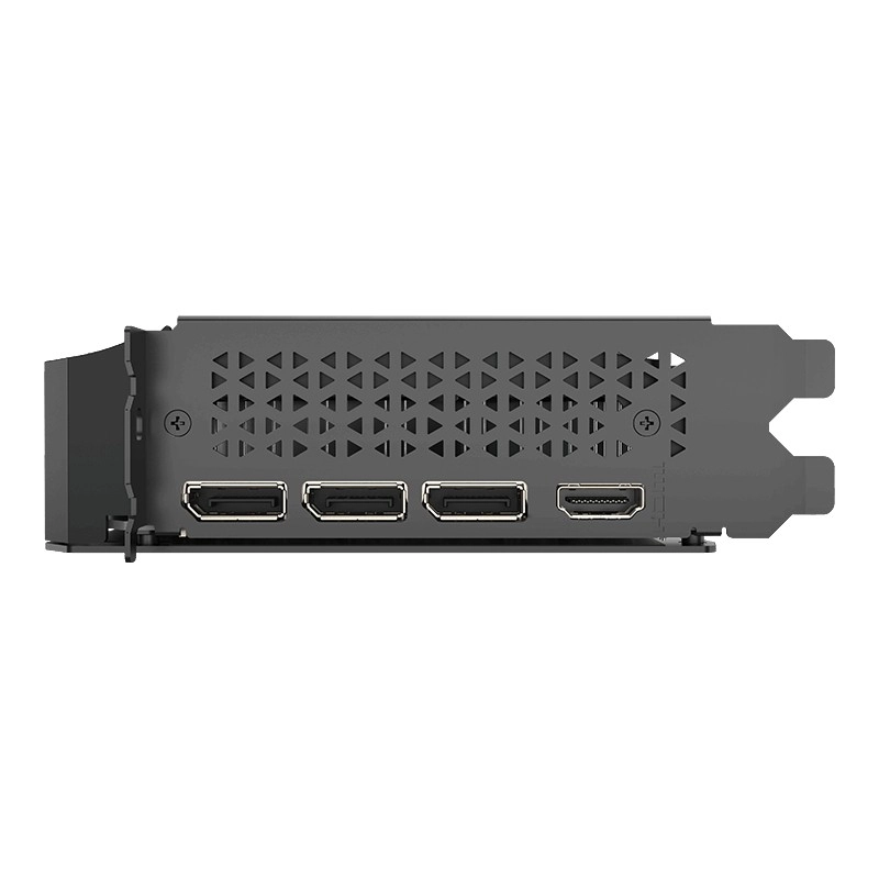 The short, single- to dual-slot design with one large axial fan and a robust metal backplate increases card rigidity and helps with better heat dissipation. On the rear panel, you’ll find HDMI and three DisplayPorts for multiple monitors and smooth multitasking.