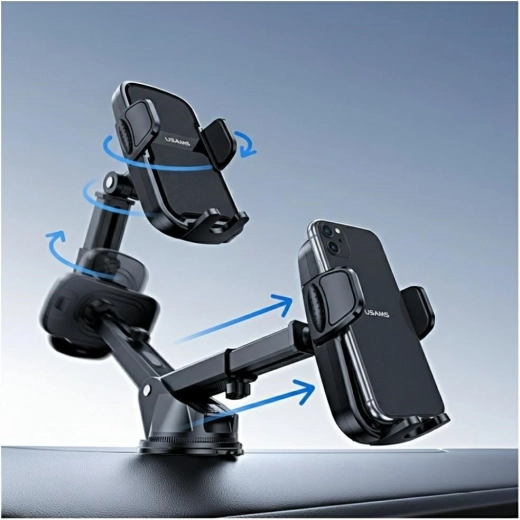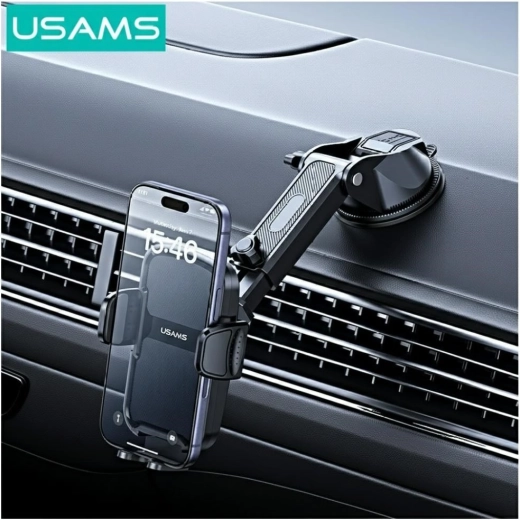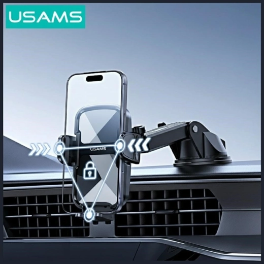 A practical and stable USAMS car mount for installation on the windshield or dashboard ensures secure phone holding, strong adhesion thanks to a powerful suction cup, and easy angle adjustment for comfortable navigation and hands-free calls.
