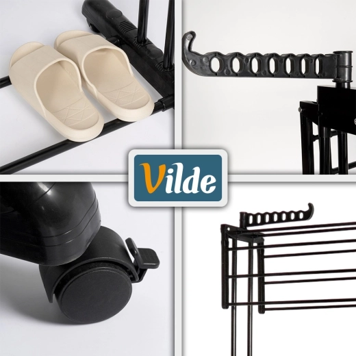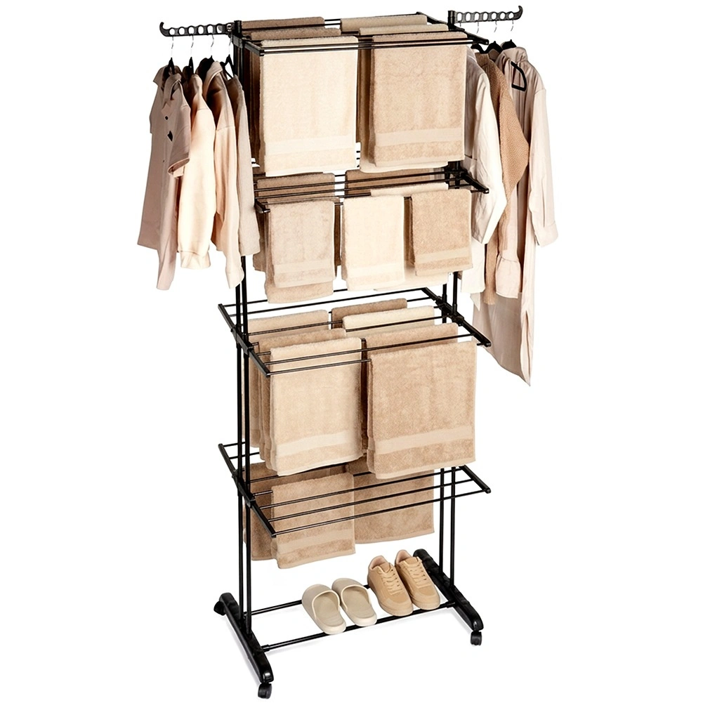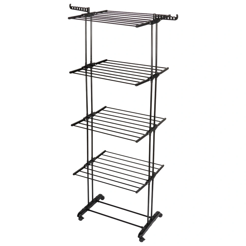 A practical vertical laundry drying rack with four levels offers up to 22.7 m of drying space, a stable metal frame, and wheels with brakes for easy moving. Thanks to the foldable wings, side arms for hangers, and a bottom shelf for shoes, it makes the most of space at home or on the balcony.