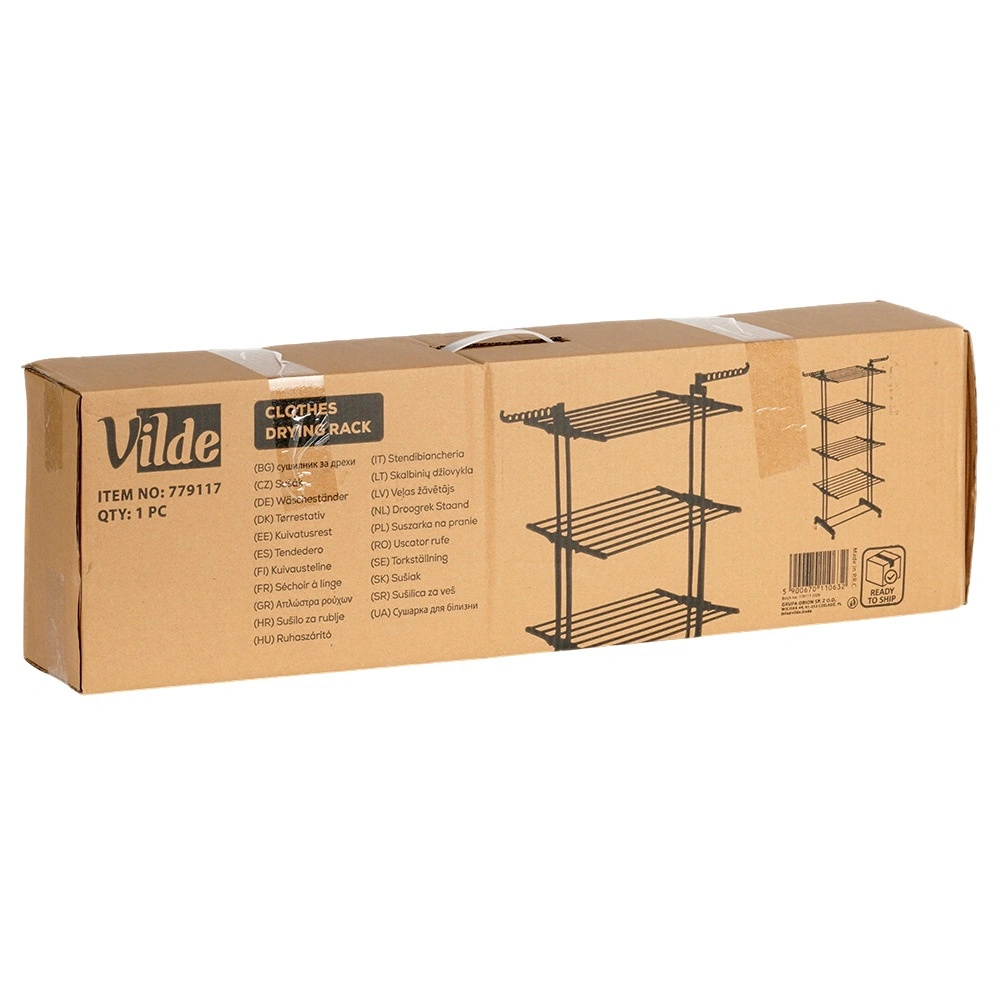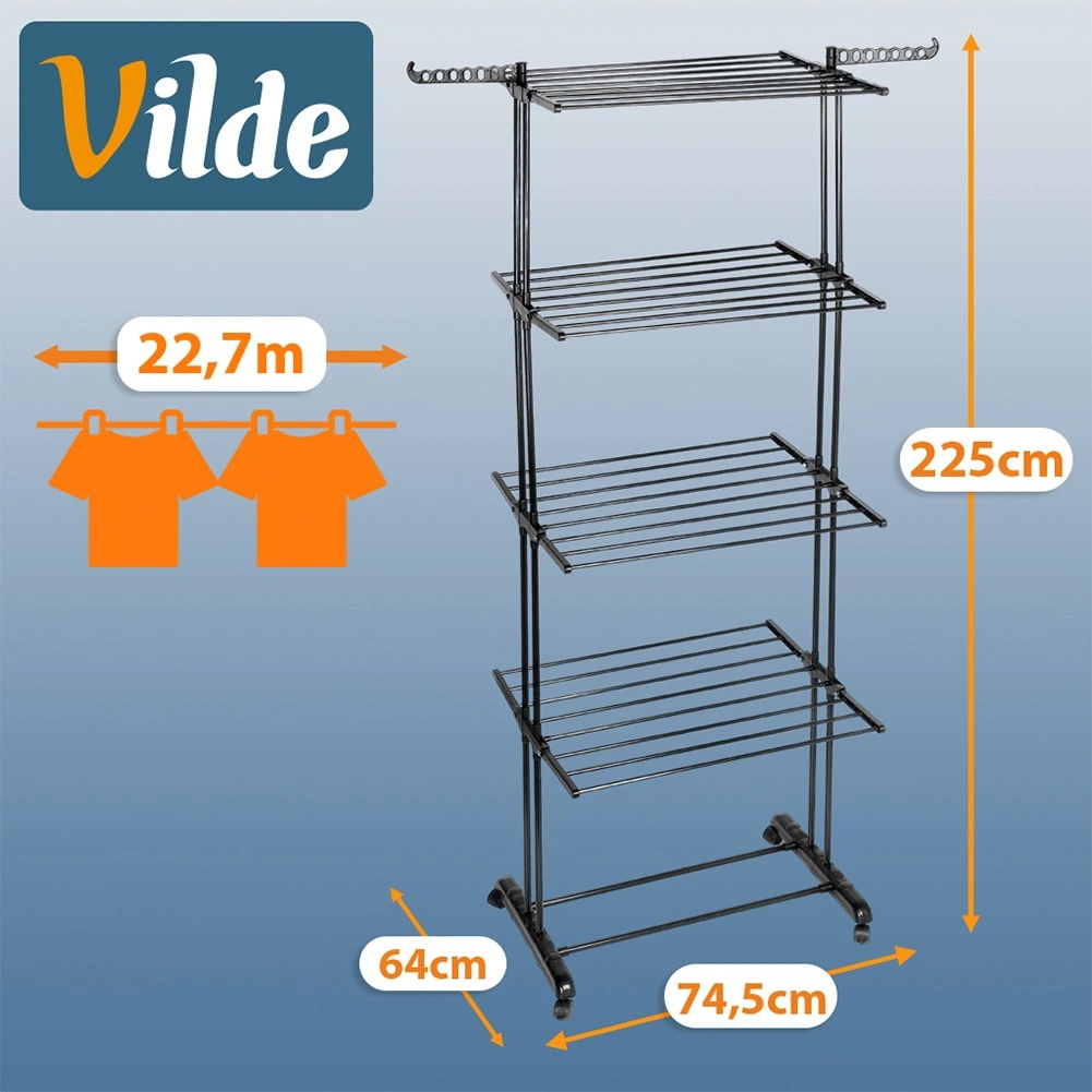 Maximize your drying space with this roomy vertical rack in elegant black. Four tiers, eight independently foldable wings, and side arms for hangers let you adapt capacity to the current laundry load. The total drying area reaches 22.7 m, and the 25 kg load capacity handles heavier textiles.