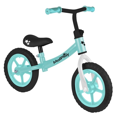 The lightweight FLIKO balance bike in turquoise and white is ideal for children from 2 years. With an adjustable saddle (31–40 cm) and handlebars (48–57 cm), it grows with your child. Large 28 cm diameter wheels ensure a stable ride, and the weight of just 1.8 kg makes it easy for parents to carry. Maximum load is 50 kg, recommended rider height 80–108 cm.