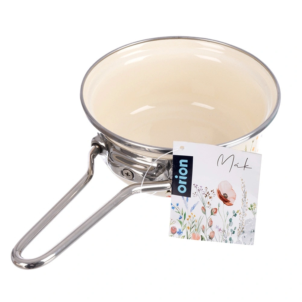 Practical cream saucepan with a diameter of 14 cm and a capacity of 650 ml, made of quality enamelled steel with a field-flowers motif. It has a long stainless steel handle, is suitable for all types of stovetops including induction and for oven use, and is dishwasher safe. Ideal for heating milk, making sauces, or boiling eggs. Proven quality by ORION.