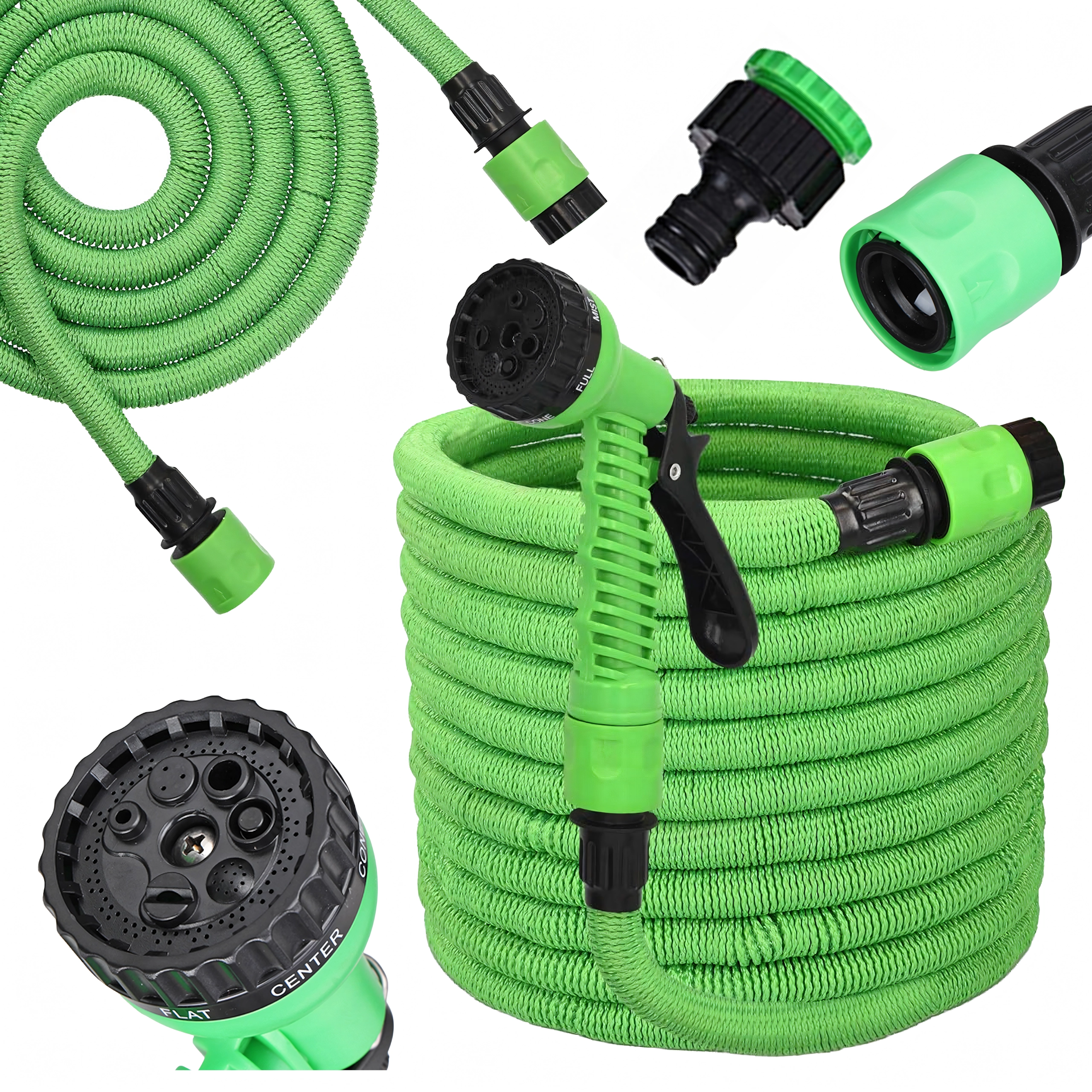 A lightweight and flexible garden hose that extends from 5 up to 15 meters when filled with water. Includes a universal spray gun with multiple modes and quick connectors for easy attachment. Ideal for watering the garden, washing the car, and cleaning around the house. Expandable design, a durable textile sheath, and a multifunction nozzle ensure comfortable, safe use without kinking.