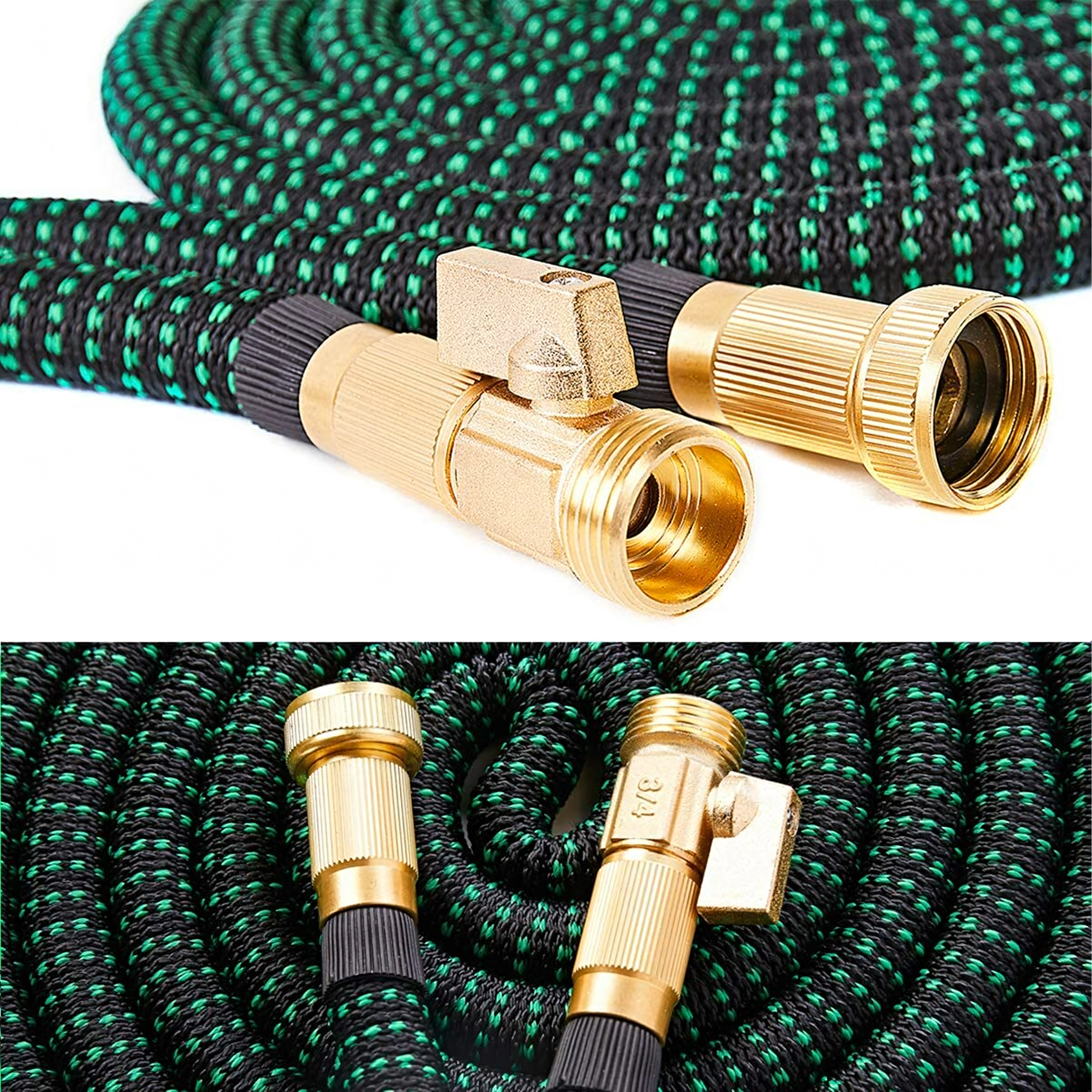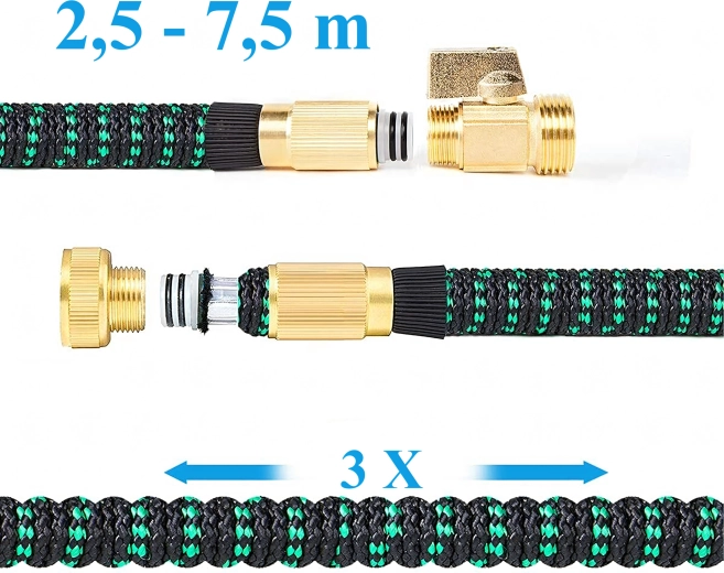 Compact and lightweight expandable garden hose 2.5–7.5 m with 1/2" and 3/4" brass connectors and a multi-mode spray gun. Durable textile jacket, kink protection, and a shut-off valve for convenient garden watering, car washing, and around-the-house cleaning.
