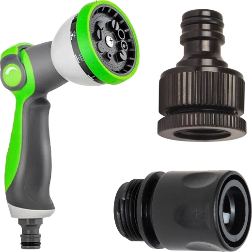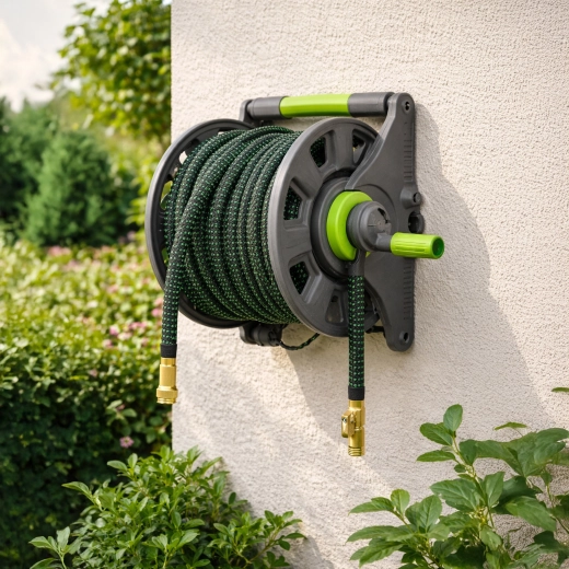 This expandable hose extends up to 7.5 m when filled with water and contracts compactly when drained for easy storage. The textile braid combined with brass quick connectors ensures durability, a tight seal, and long service life. The ergonomic spray gun offers multiple flow settings from fine mist to a strong jet.
