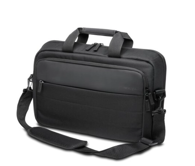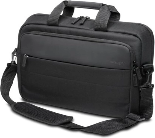 Lightweight and durable laptop bag up to 16" with a modern minimalist design, made from recycled materials. Features a padded compartment, a practical front zip pocket for quick access, clamshell construction for easy organization, and a trolley sleeve for comfortable travel. Includes a padded shoulder strap and a two-year limited warranty.