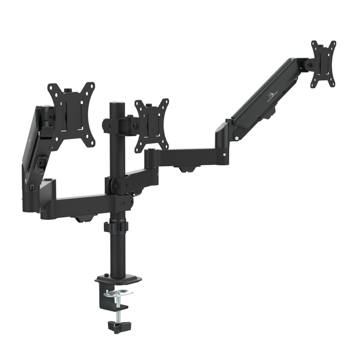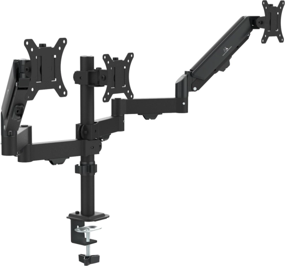 A universal triple monitor mount for 17–27" screens with a load capacity of 2–8 kg per monitor delivers ergonomics, space savings, and maximum flexibility. Two side arms with gas springs enable smooth height, tilt, and swivel adjustment, while the center monitor is firmly and stably fixed to the central column for a balanced, professional workspace.