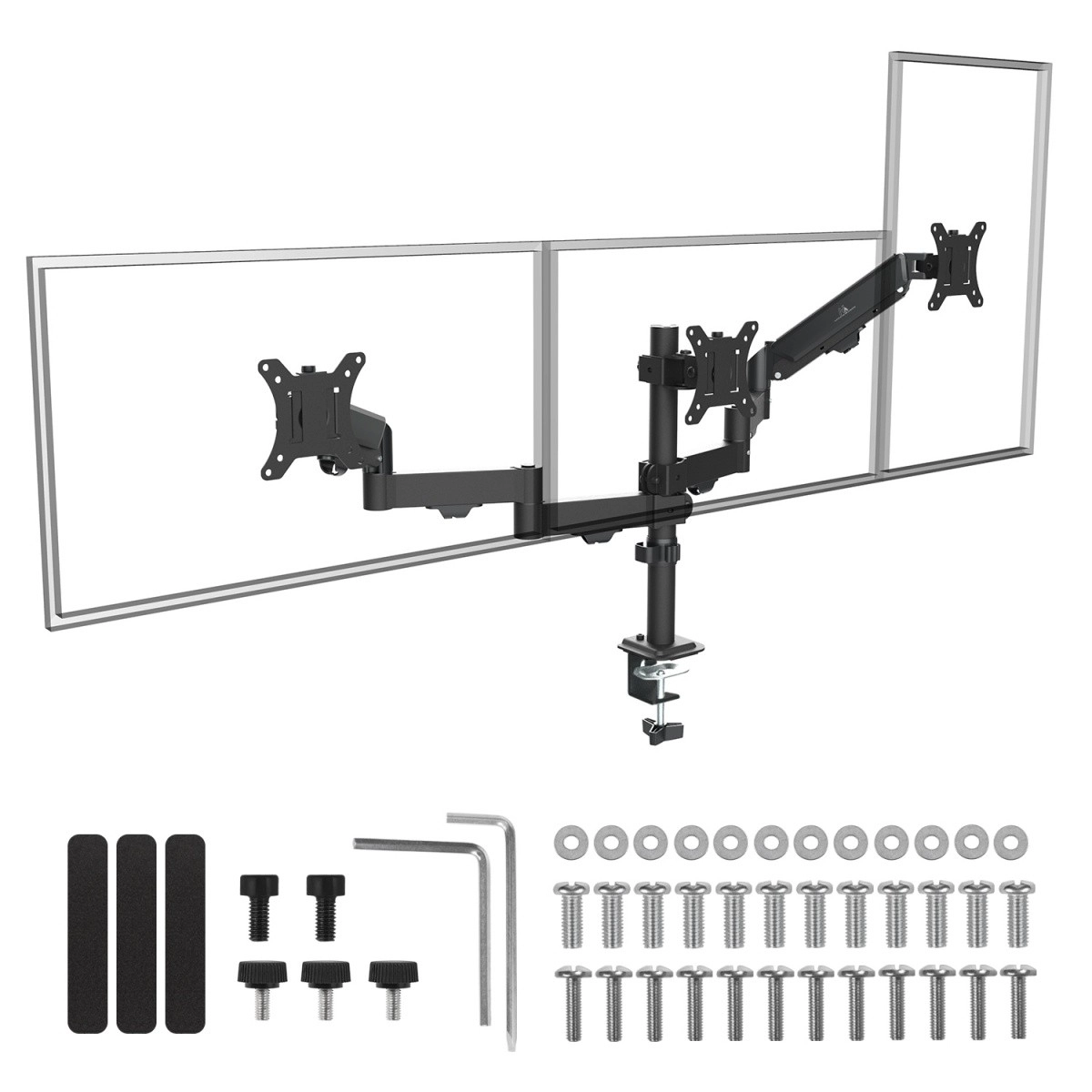 The two side arms with gas springs allow effortless and precise height positioning, including tilt and swivel for the perfect viewing angle. The center monitor mounts directly to the central column, providing a solid base and a uniform line across all three screens. Thanks to VESA mounting and a well-thought-out design, you can easily achieve an ergonomic setup and a clean desk.