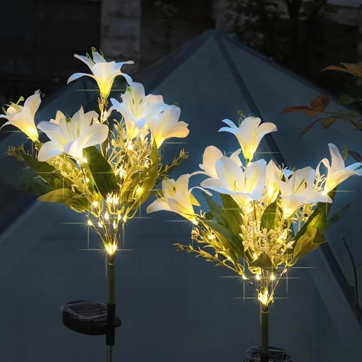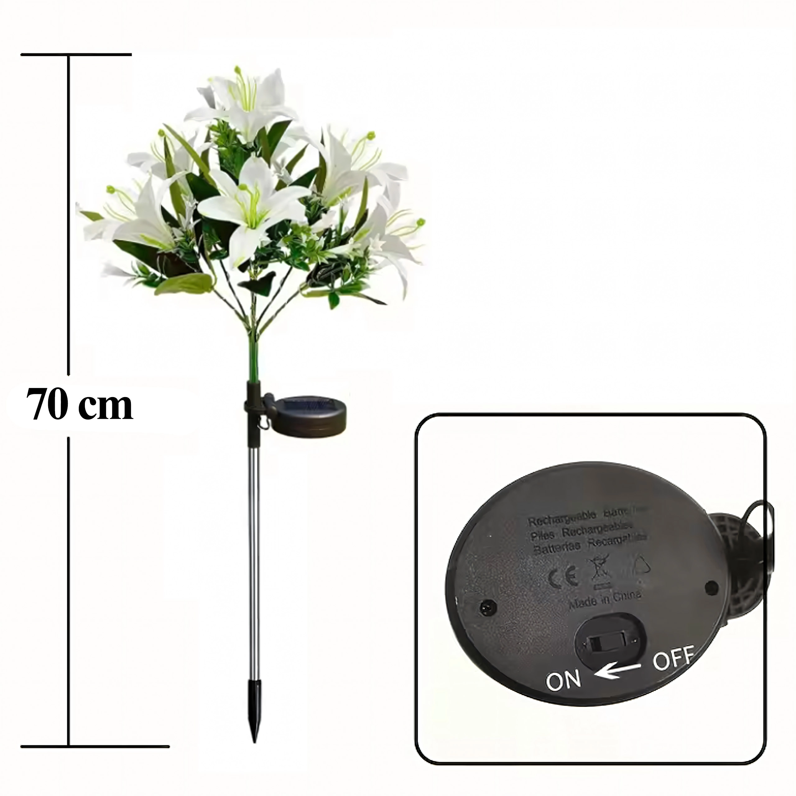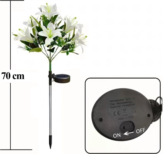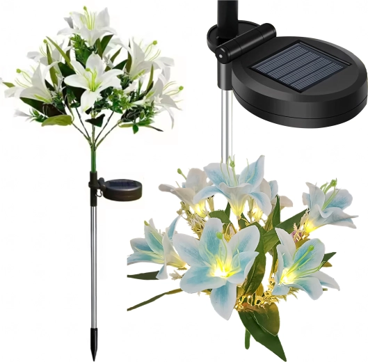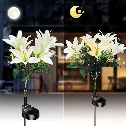 Decorative solar lily-shaped light brightens your garden, balcony, or patio with a pleasant warm glow. Thanks to solar power, it charges during the day and turns on automatically at dusk. A durable build, realistic blossoms, and easy installation with a single ground stake make this lamp a stylish and low-maintenance outdoor decoration with energy-saving LEDs and automatic night lighting.