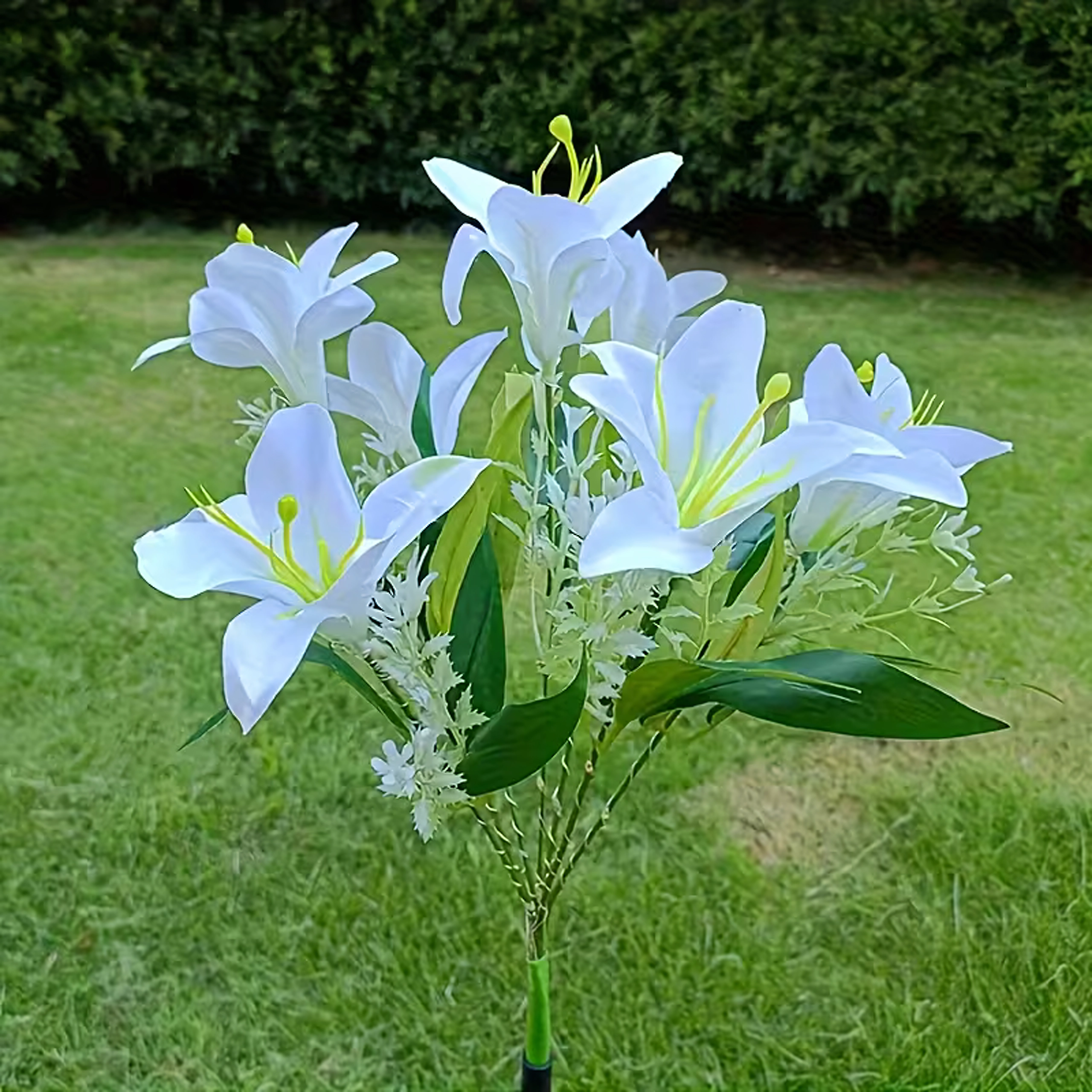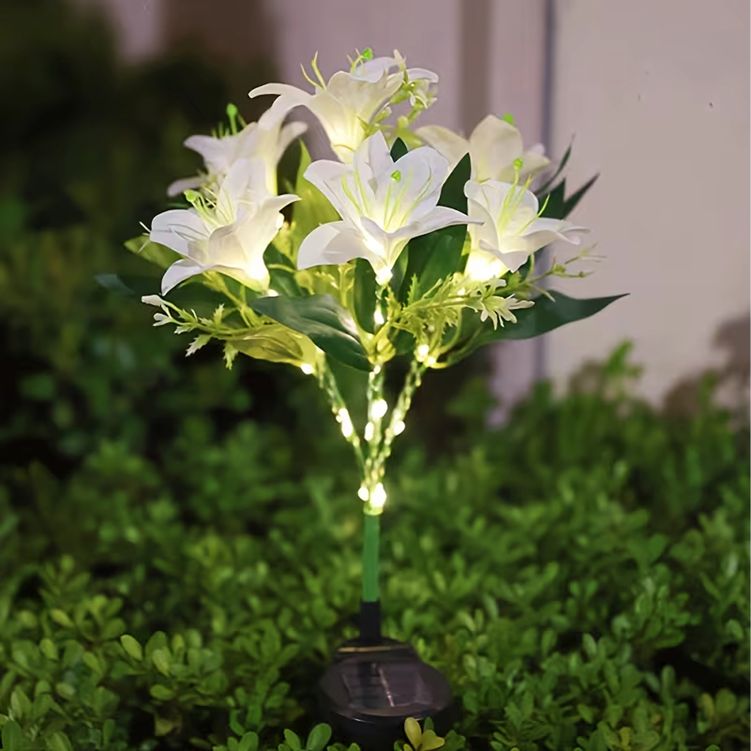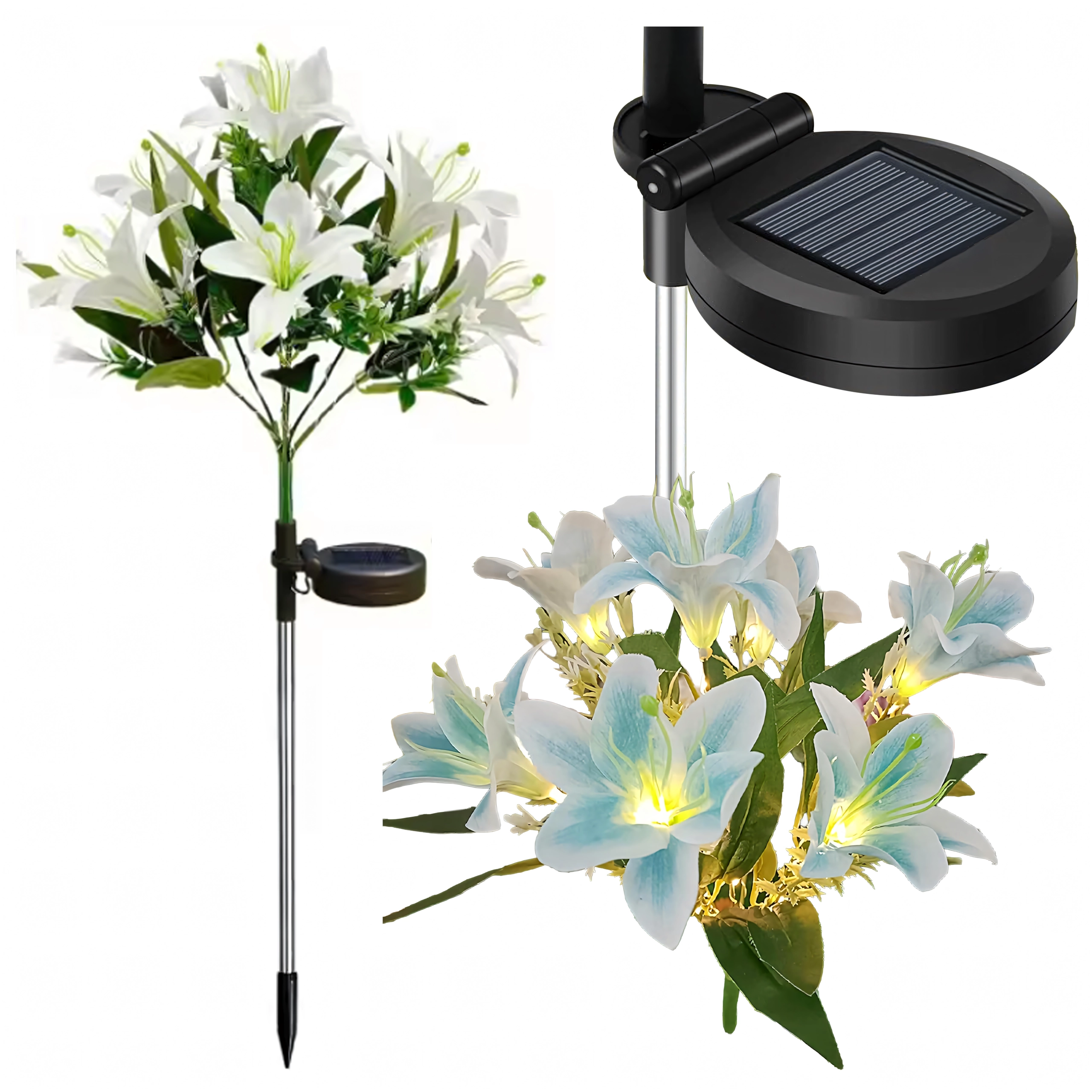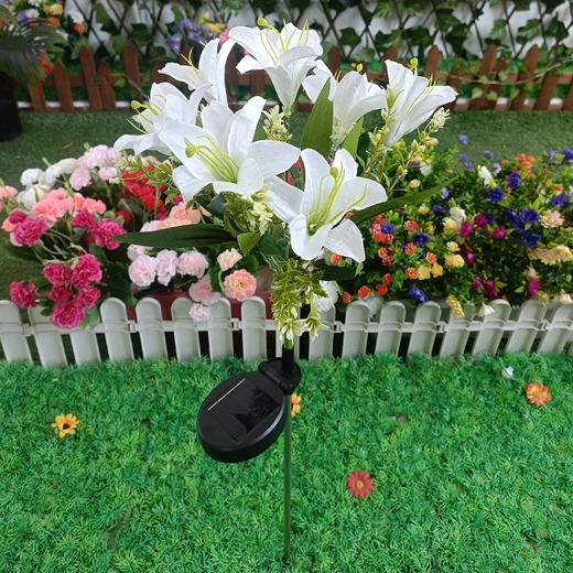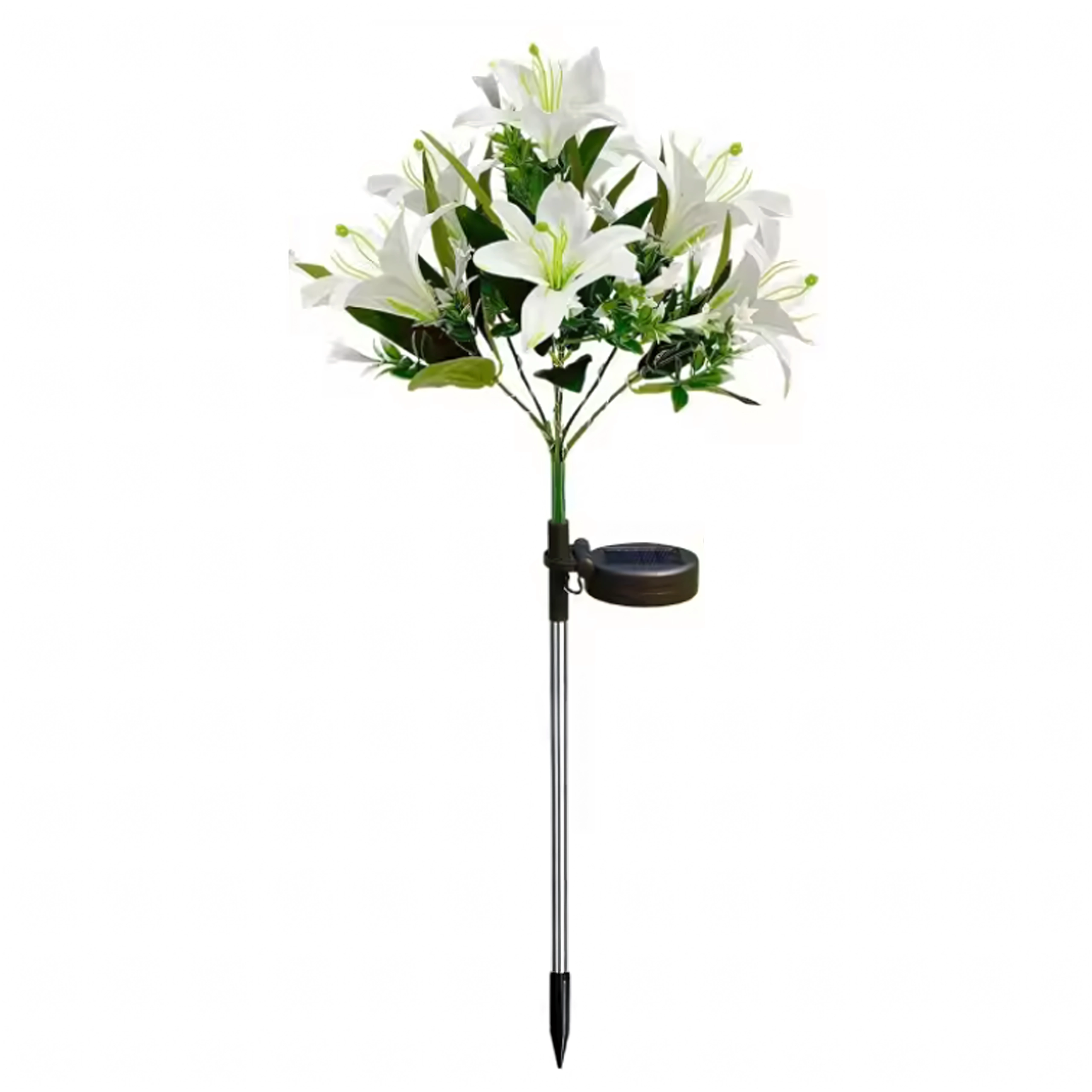 Create a magical atmosphere with a solar decorative lamp in the shape of a lily. Realistic blossoms and leaves are complemented by warm LED light that gently shines through the petals, highlighting flower beds, paths, and planters. Simply stake it in the ground, aim the panel toward the sun, and the integrated solar panel takes care of the rest.