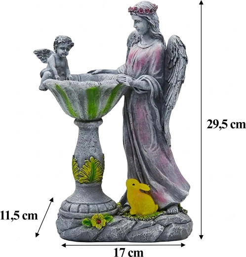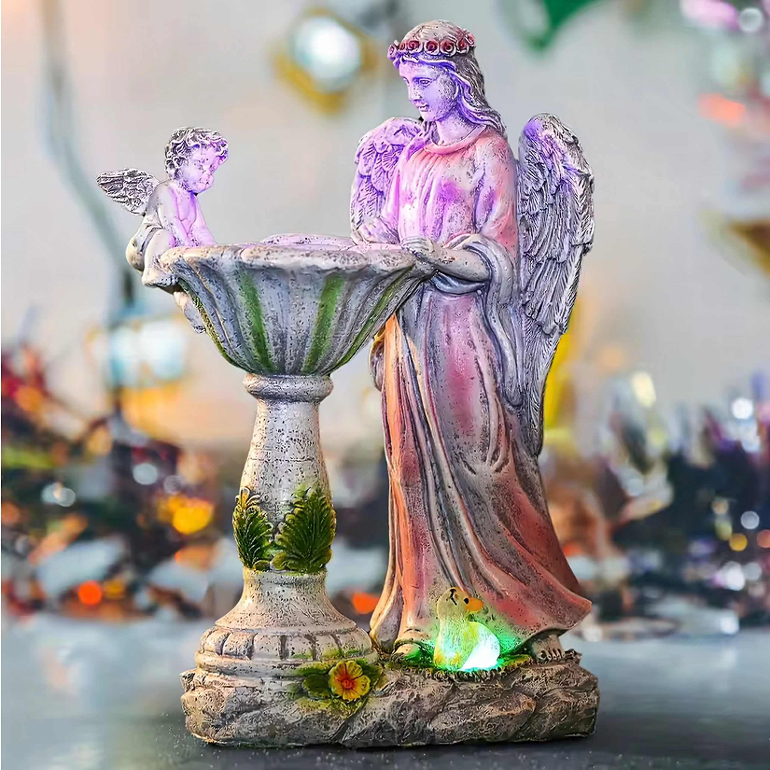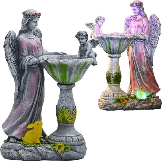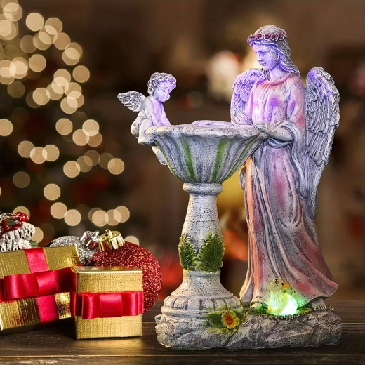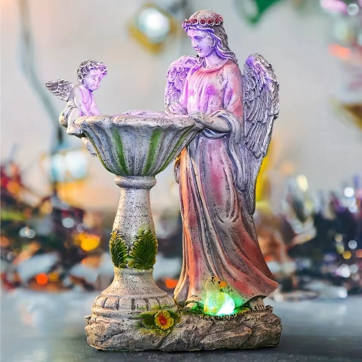 Built-in LEDs illuminate the bowl and base in RGB colors, so the angelic decoration shines after dark without any wiring.