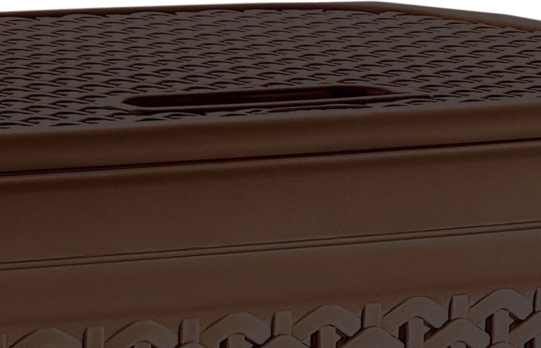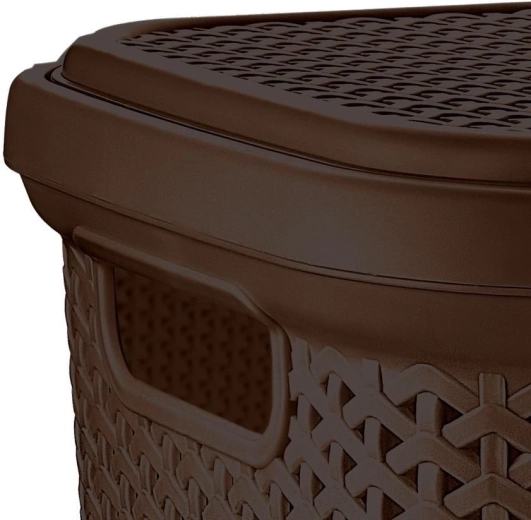 Practical and elegant 55 l laundry basket with a closable lid. Thanks to its slim shape, it fits even in smaller bathrooms; the lightweight and durable construction made of plastic with a rattan look ensures excellent air circulation and easy carrying using integrated handles.