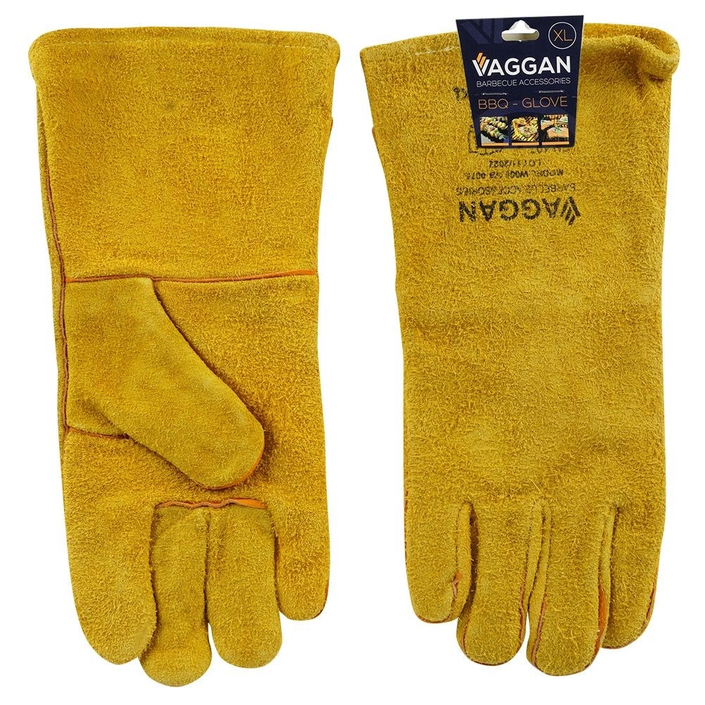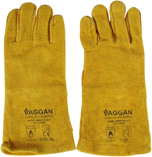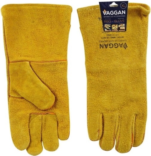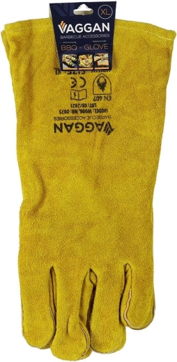 A pair of high-quality leather grilling gloves, 34 cm long and size XL, reliably protect hands and forearms from heat. Thanks to the inner fleece lining they are comfortable, and the soft mustard-tone leather is also resistant to high temperatures. They meet standard EN 407 and protection class BC, making them suitable for the grill, oven, and stovetop.