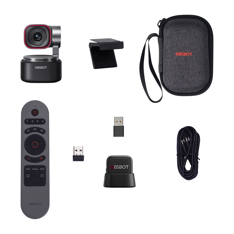 - OBSBOT Tiny 3 webcam; OBSBOT Tiny Smart Remote 2; OBSBOT Vox SE microphone; Adjustable mount; USB‑C to USB‑C cable; USB‑C to USB‑A adapter; Case