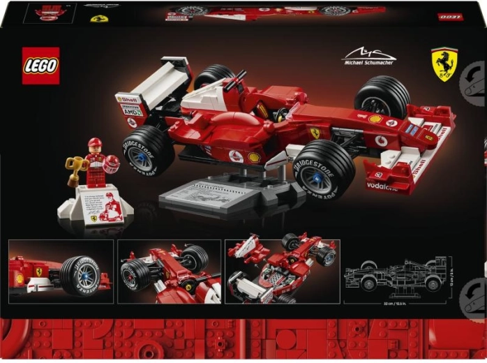 Celebrate the golden era of F1 with the exclusive LEGO Icons Ferrari F2004 building set and a Michael Schumacher minifigure. This detailed model of the legendary single-seater features functional steering, a realistic cockpit, an inline V10 engine, and Bridgestone Potenza printed tires. Includes a display stand with stats, a minifigure with a helmet and trophy, and a stylish podium with print and quote. A perfect gift for F1 fans and an elegant display piece.