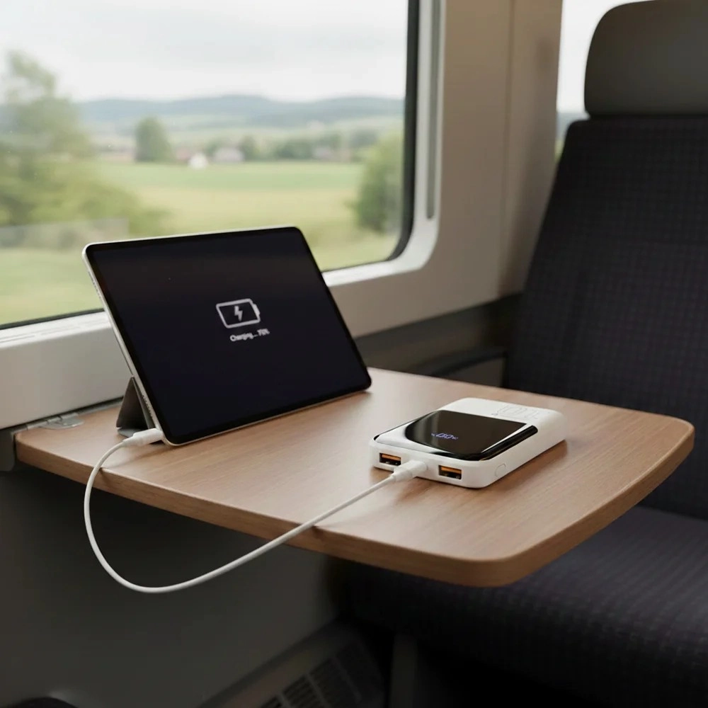 The power bank supports leading fast-charging standards: PD3.0, PPS, QC4+, QC3.0/QC2.0, Apple 2.4A, DCP, Huawei FCP/SCP, VOOC, and MTK-PE+2.0. Thanks to automatic adjustment of voltage and current, it charges efficiently and gently. The pass-through function allows you to power connected devices while charging the power bank itself—perfect for the office, overnight charging, or a mobile workspace.