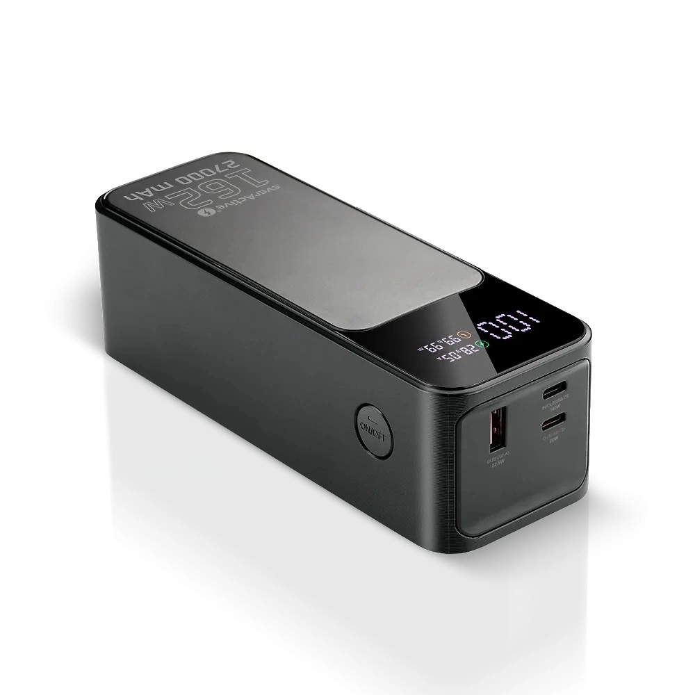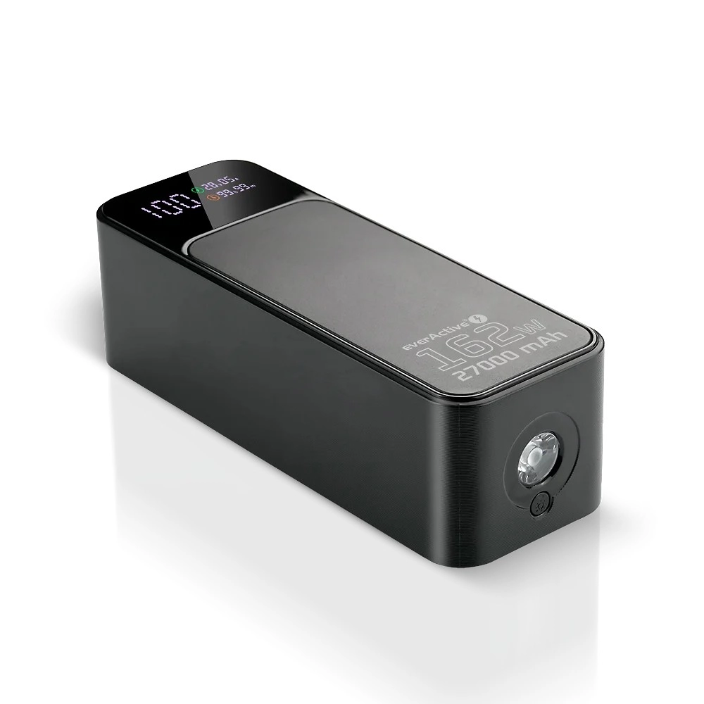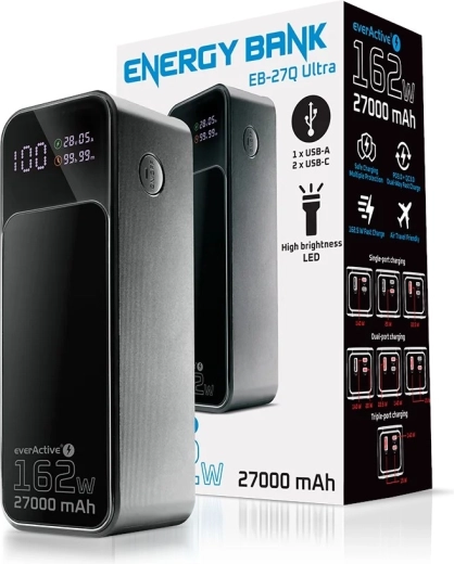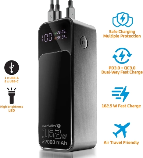 Power Bank 27,000 mAh with LCD Display, 2× USB‑C, 1× USB, Fast Charging 162.5 W, Built‑in Flashlight