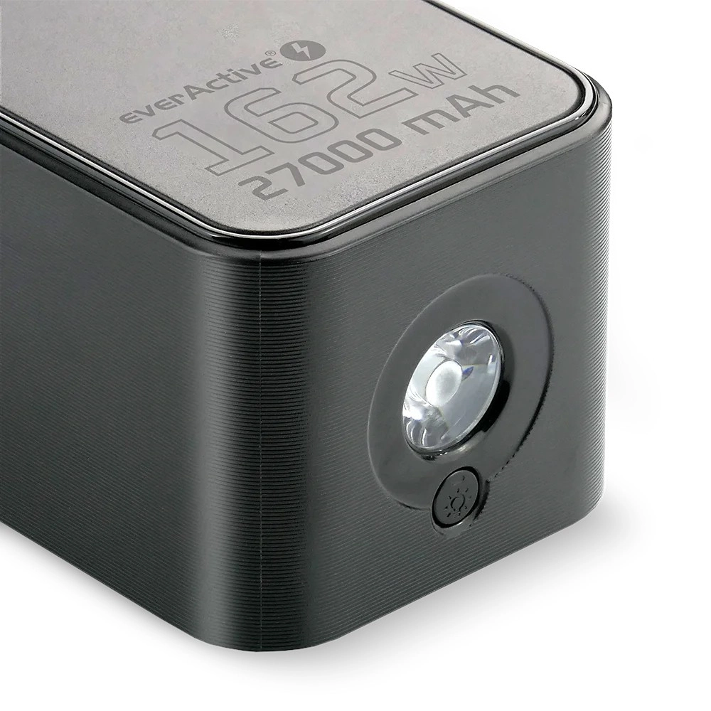 A high-performance power bank with a capacity of 27,000 mAh and a total output of up to 162.5 W offers top-tier PD 3.1 fast charging up to 140 W, three outputs (2× USB‑C, 1× USB‑A), pass‑through functionality, a clear LCD display, and a built‑in LED flashlight with 4 modes. Ideal for travel and work, fully compatible with PD, PPS, QC4+, QC3.0 standards and protections for safe charging.