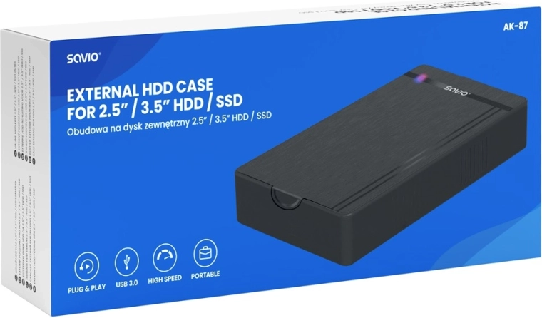 Turn an internal drive into portable storage in moments. The AK-87 external enclosure offers Plug & Play with no driver installation, USB 3.0 with speeds up to 5 Gb/s, support for SSD/HDD SATA 2.5" and 3.5", and capacity up to 16 TB. A lightweight, compact design with a power adapter for 3.5" drives ensures stable and fast data transfer on Windows, macOS, and Linux systems.