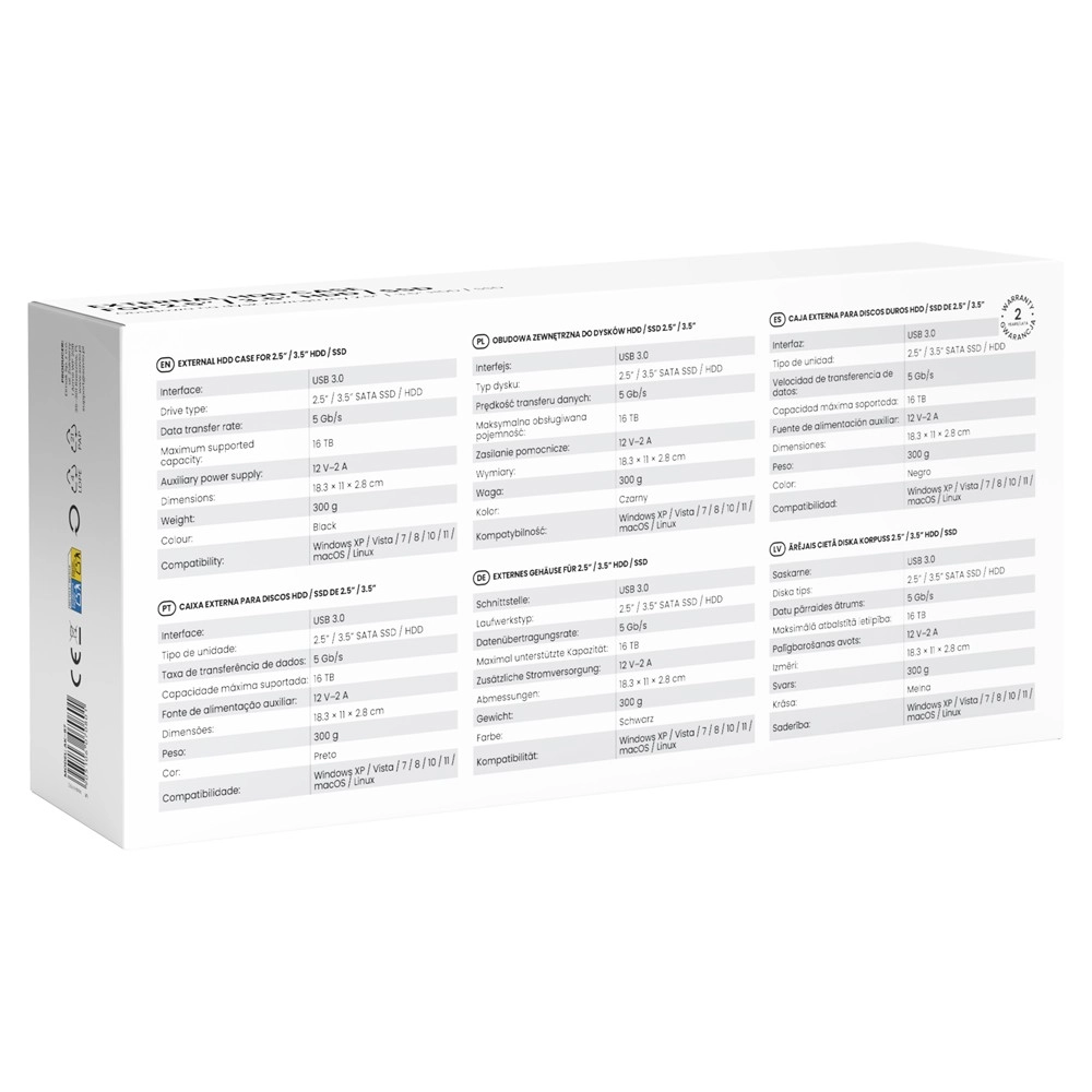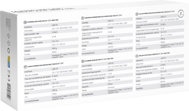 The device is universal and works seamlessly with Windows (XP/ Vista/ 7/ 8/ 10/ 11), macOS, and Linux. It supports SATA drives in 2.5" and 3.5" formats, including traditional HDDs as well as fast, quiet SSDs. For stable operation of 3.5" drives, a 12 V / 2 A power adapter is included.