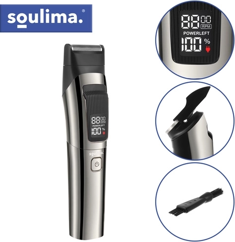 The SOULIMA universal trimmer and shaver combines hair, beard, and body care in one device. With interchangeable heads and attachments, you can easily handle cutting, contouring, and smooth shaving without irritation. A digital display, USB‑C charging, IPX6 water resistance, and up to 90 minutes of runtime make it an ideal choice for home styling and travel.