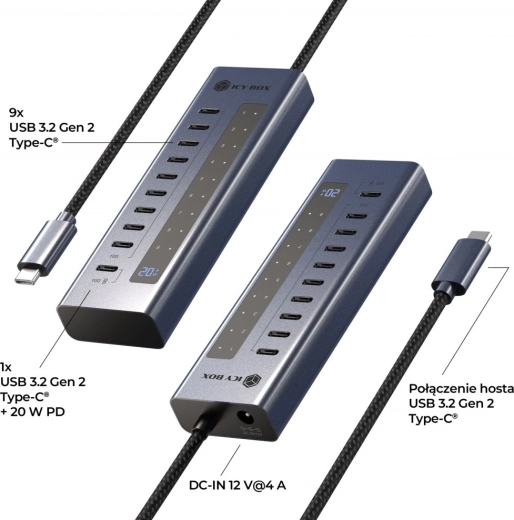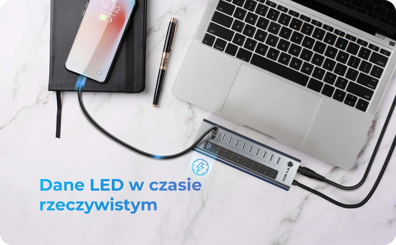 The unique dedicated USB-C port with 20 W Power Delivery supports both 10 Gb/s data and fast charging for your phone or tablet. The integrated LED display shows PD output power in real time, giving you instant insight into power draw at a glance.