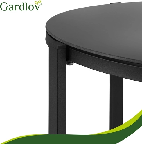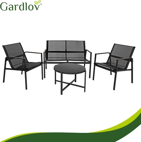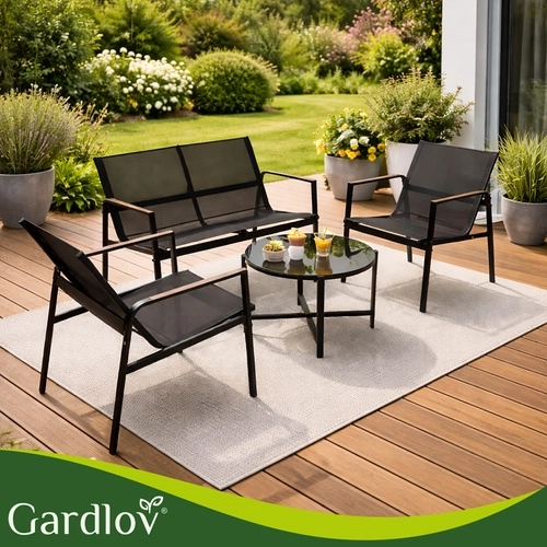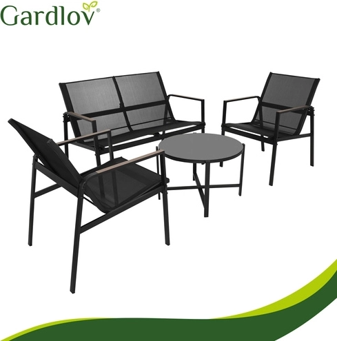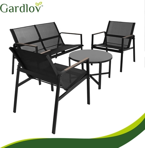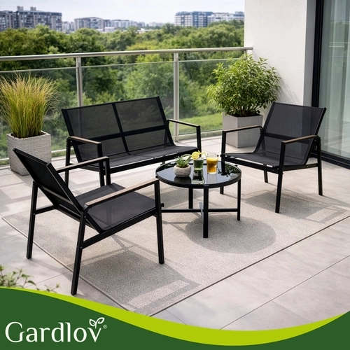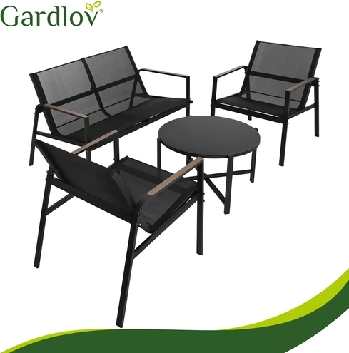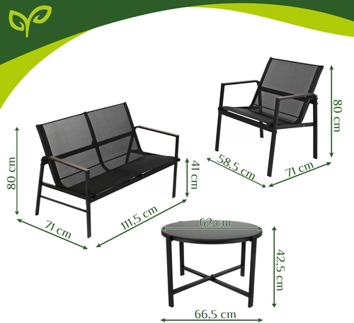 Elegant and practical set for balcony, terrace, or garden – ideal for morning coffee, evening gatherings, and comfortable relaxation. The breathable Teslin seats ensure comfort even on warm days, while the galvanized steel guarantees long life outdoors. Wood-look accents on the armrests add style without demanding maintenance.
