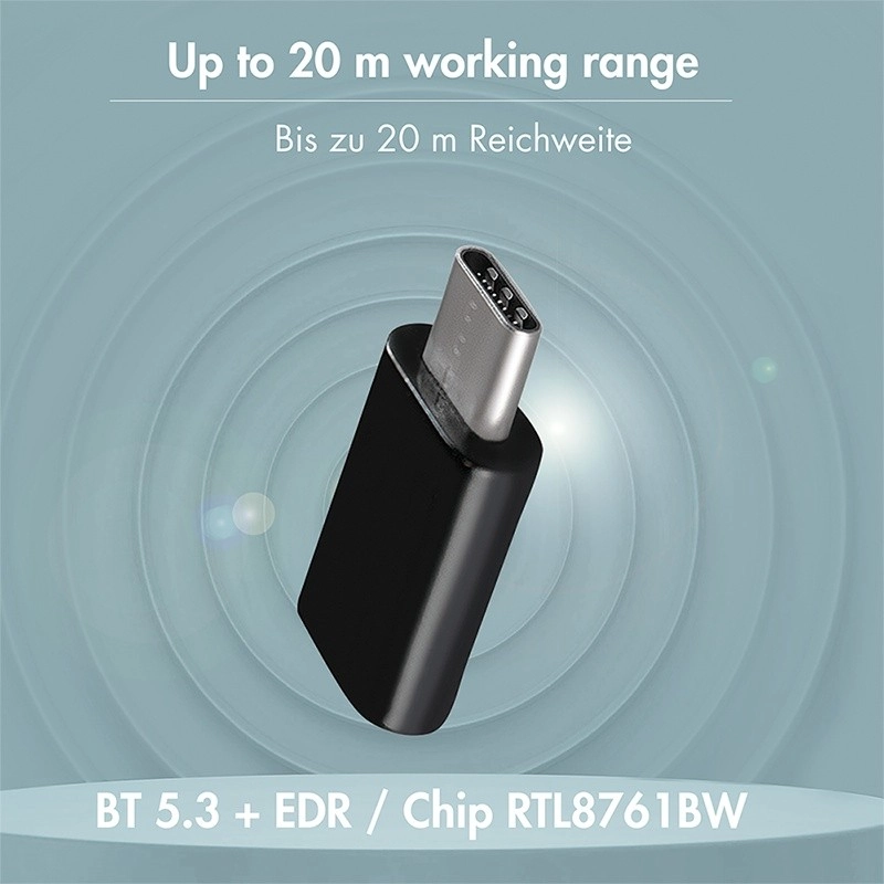 A compact USB‑C Bluetooth adapter in BT 5.3 offers stable connectivity, higher transfer speeds up to 3 Mb/s, and lower power consumption compared to older standards. Thanks to the USB‑C connector, it is widely compatible with modern devices, and a range of up to 20 m ensures convenient wireless use at home or in the office.