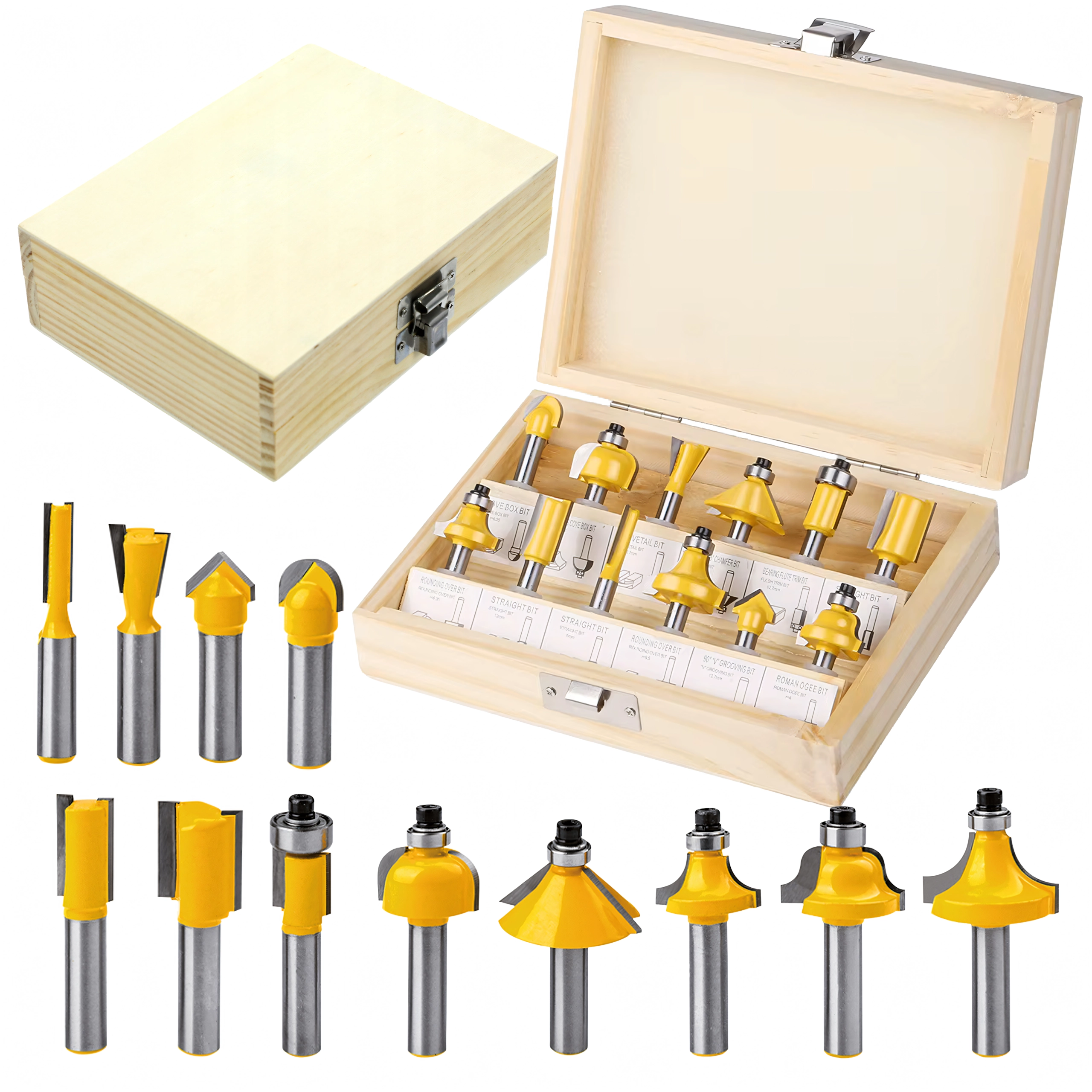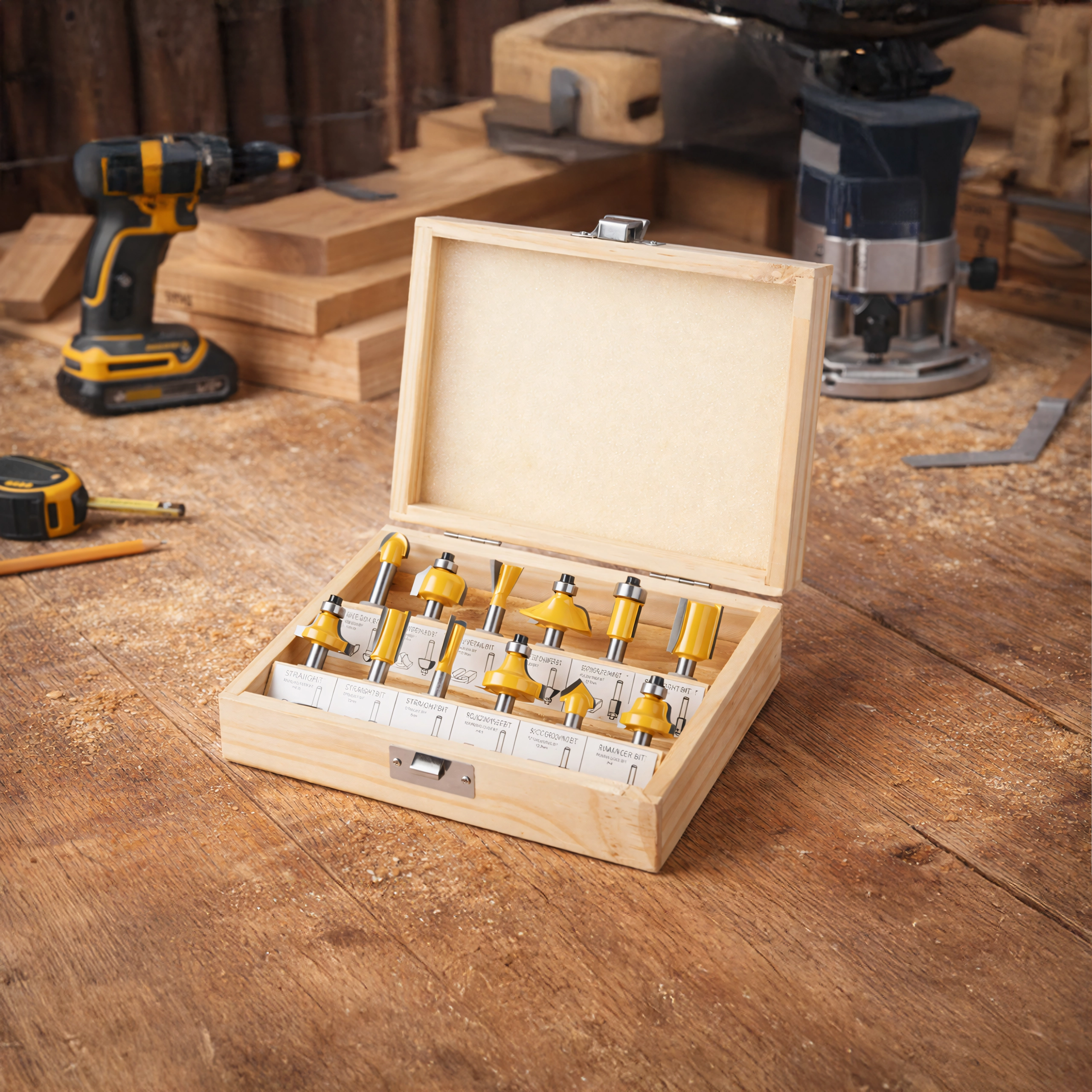 Each piece is stored in a durable wooden case with a clear layout that protects the tools during transport and speeds up work in the shop. The set is suitable for most common trim/handheld routers with a 1/4" collet.