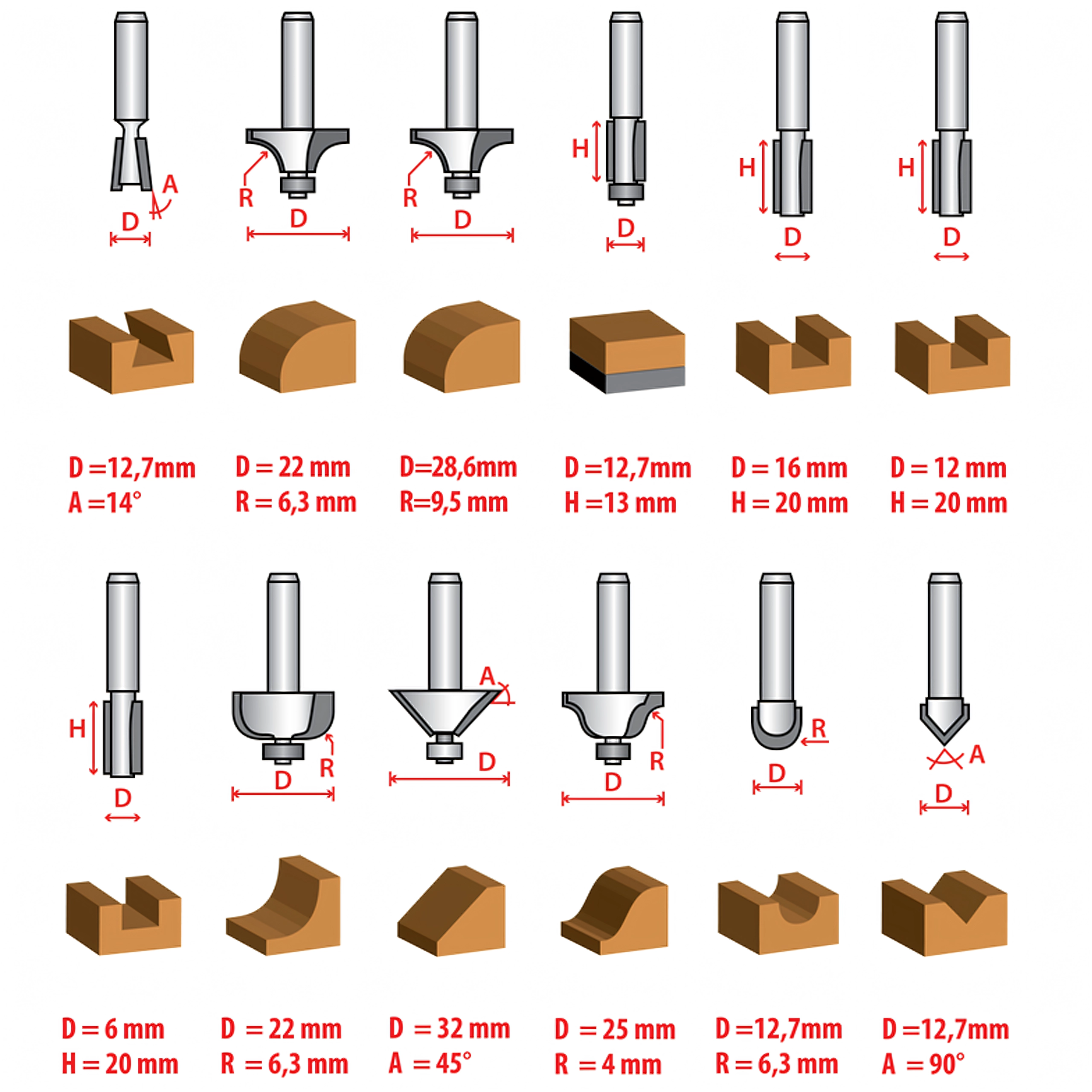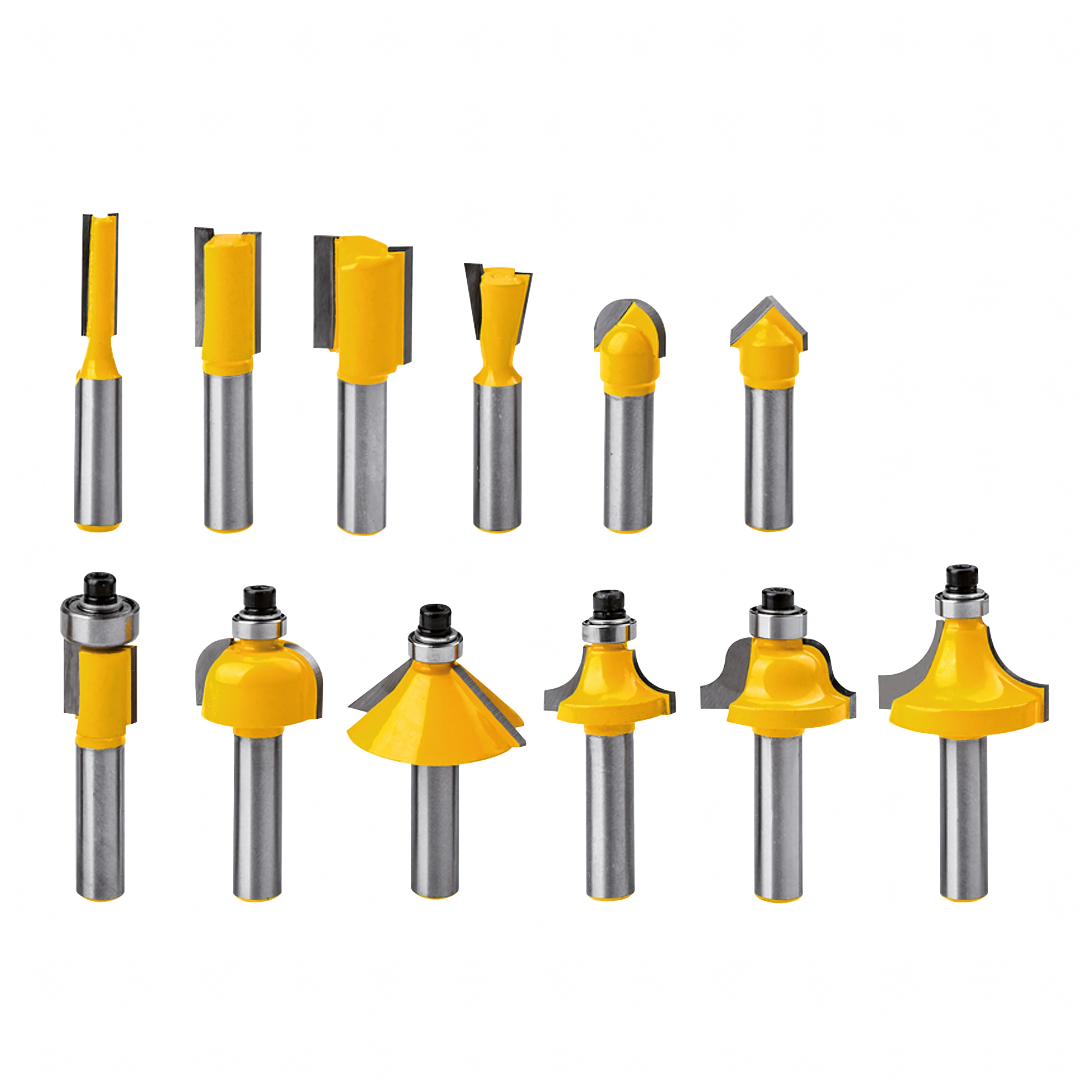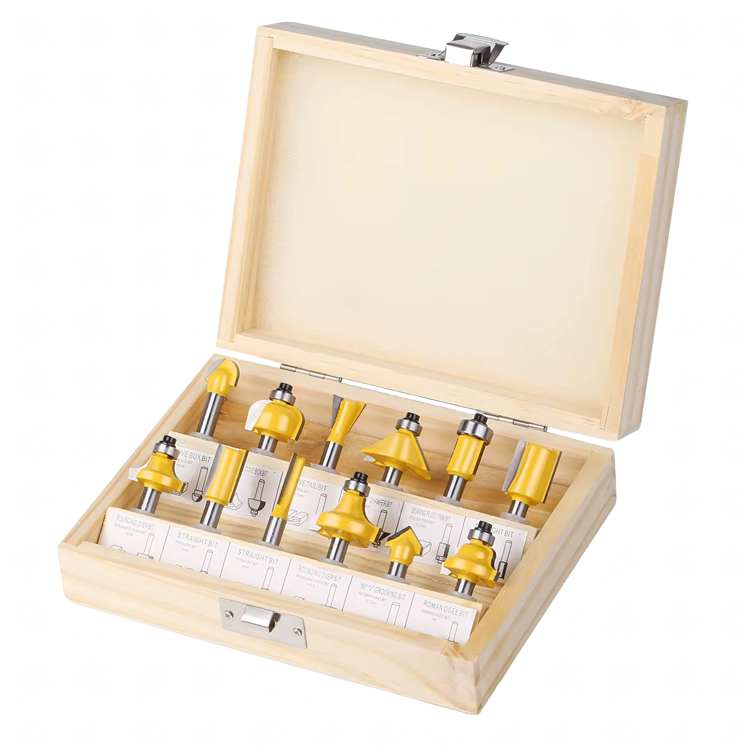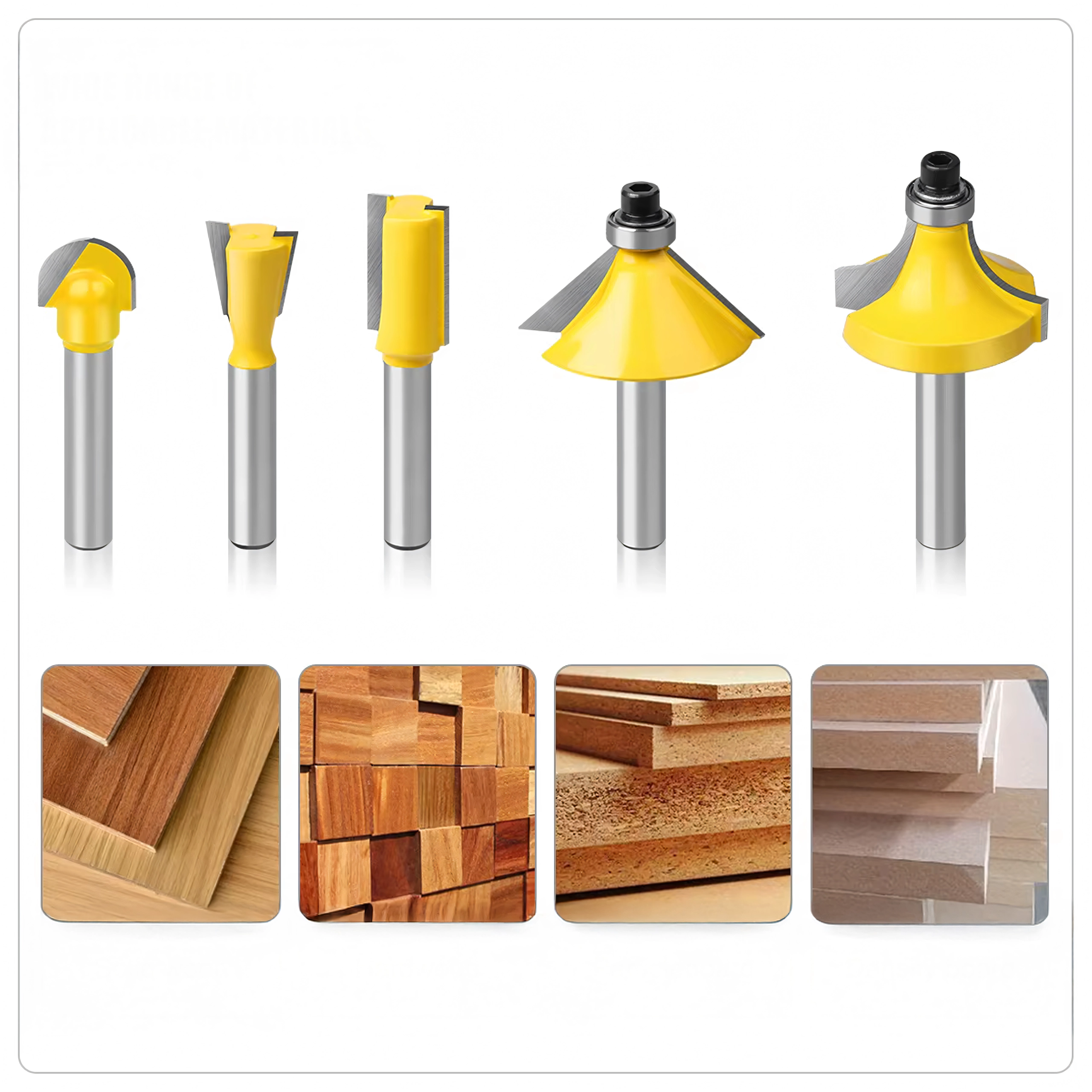 The set covers the most common woodworking operations: trimming, edge profiling, grooving, and decorative cuts. Ideal for furniture, frames, moldings, and panels.