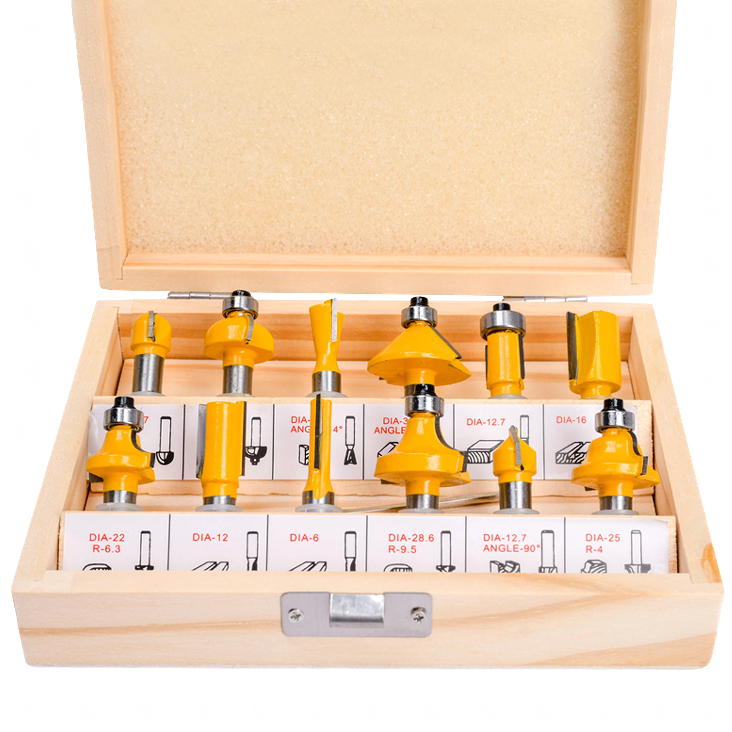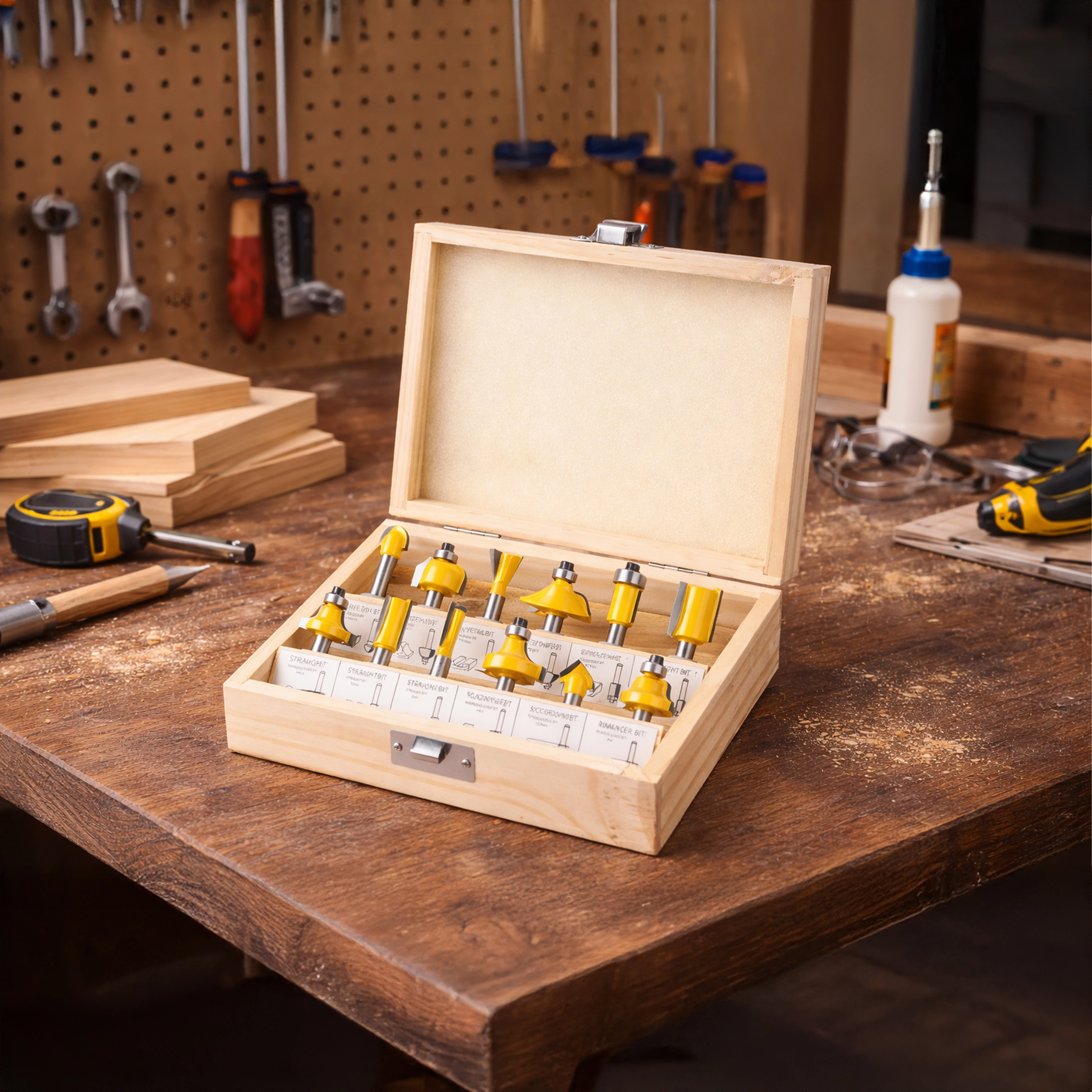 This compact set of 12 profiling router bits with carbide edges is designed for clean, repeatable cuts. It includes the most-used profiles for roundovers, chamfers, V-grooves, and straight routing, so you can easily finish the edges of furniture parts, frames, and cladding.