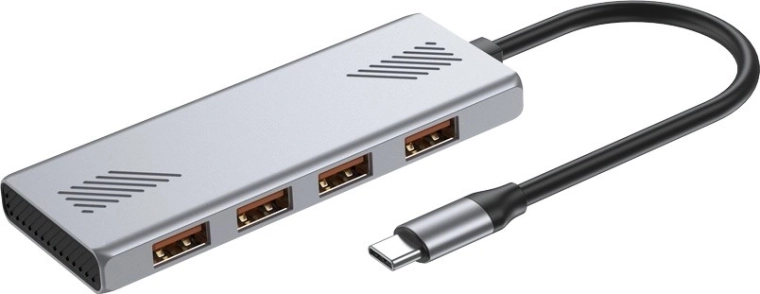 A compact USB-C hub with a metal body offering 4 USB‑A ports and transfer speeds up to 10 Gb/s thanks to the USB 3.2 Gen 2 standard. Ideal for laptops, PCs, and USB‑C/OTG devices, with an integrated cable for easy connection and broad compatibility with USB 3.x and 2.0.