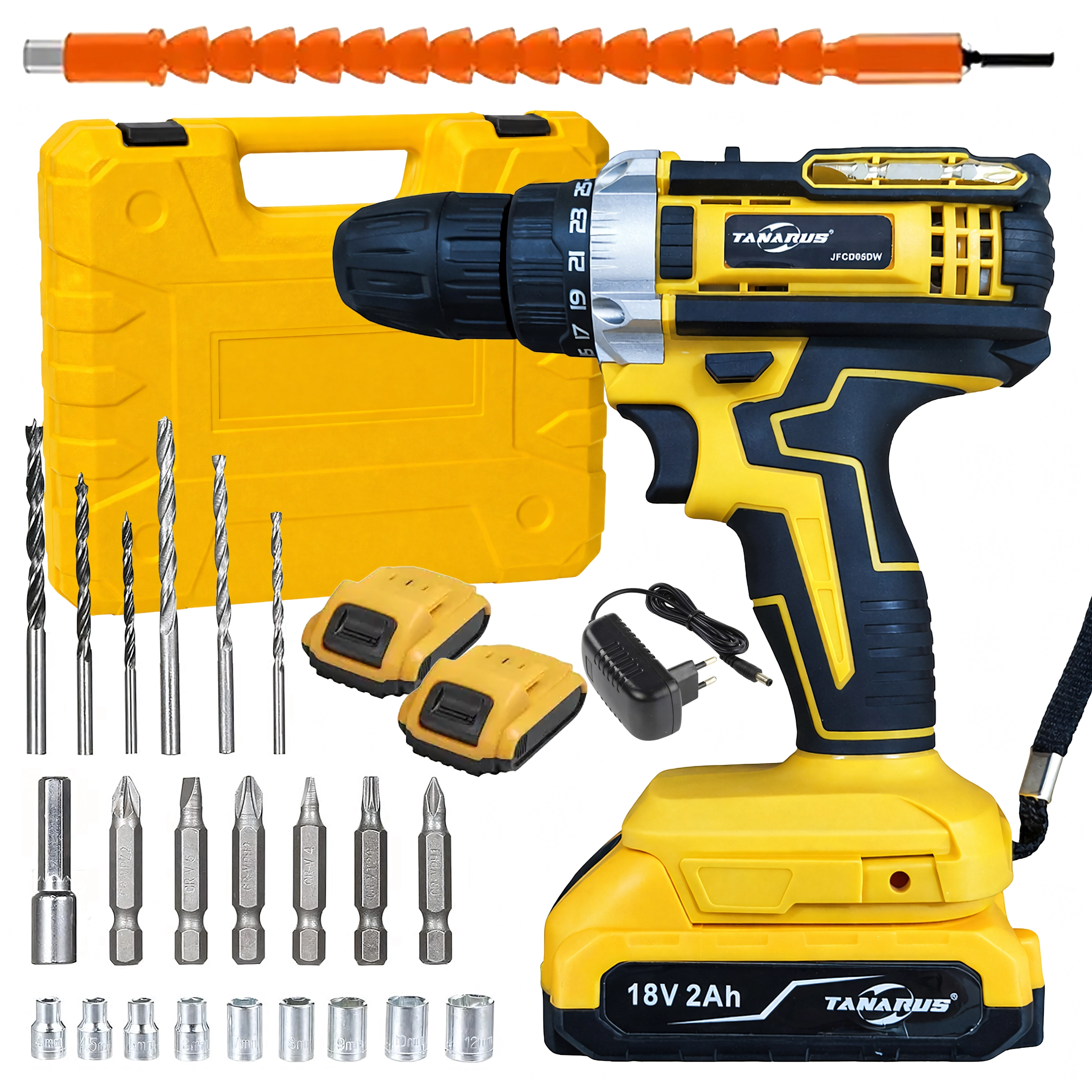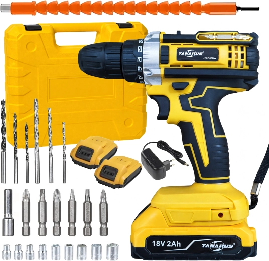 Powerful 18 V cordless drill/driver with two 2 Ah batteries, a practical case and a rich set of accessories for drilling and driving. Thanks to its compact body, ergonomic handle and LED lighting, you can work precisely even in hard-to-reach areas. Two batteries ensure continuous operation and the case keeps everything neatly organized.