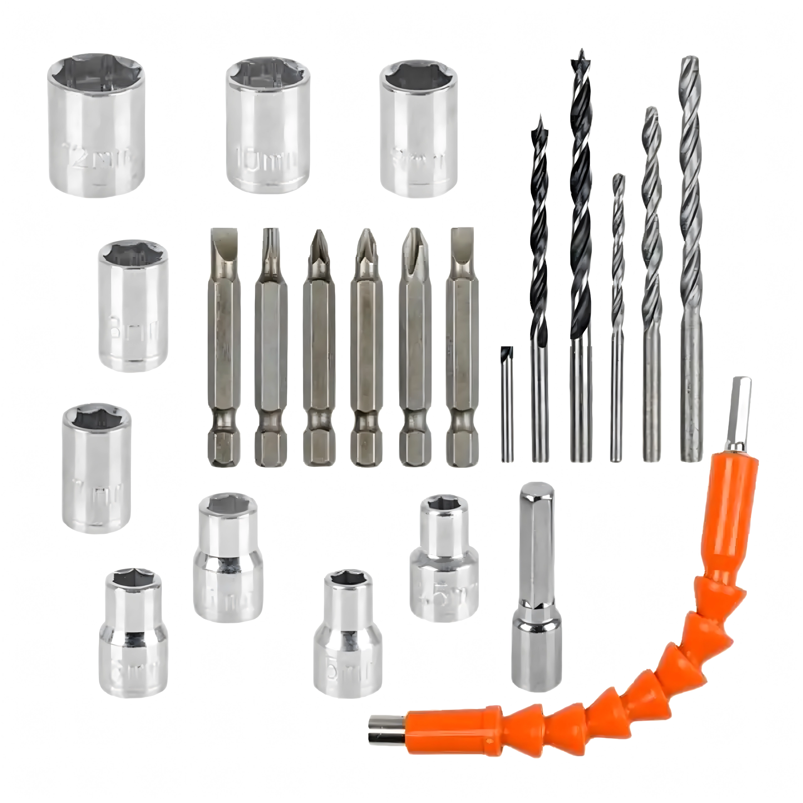 The durable case keeps everything tidy and in place. A set of bits, drill bits and a flexible extension make work easier even in tight spaces.
