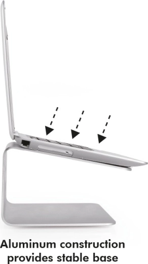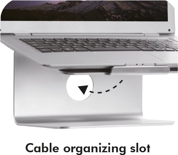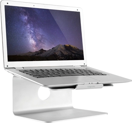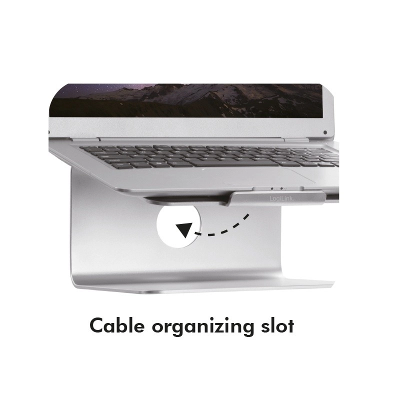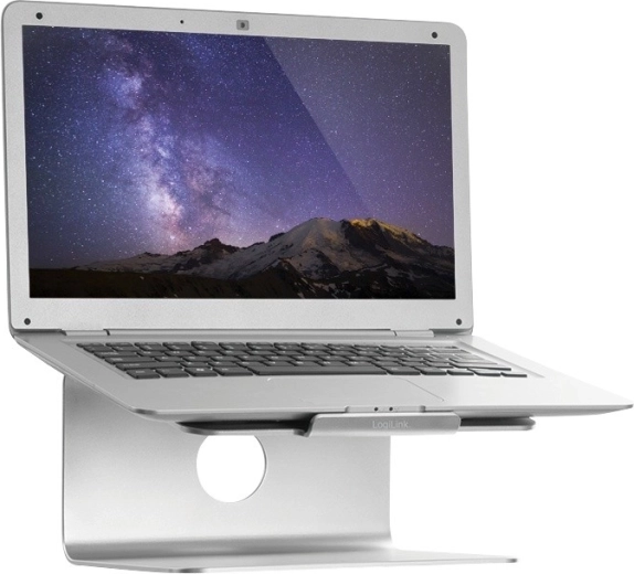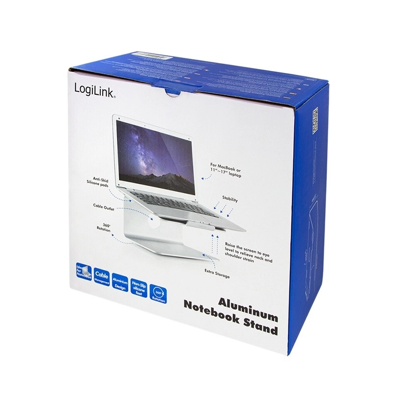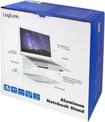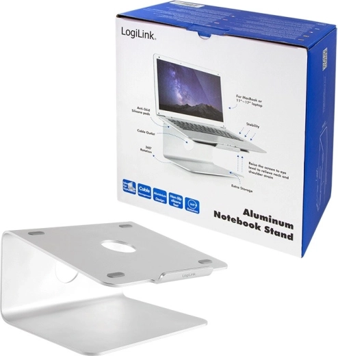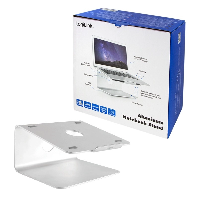 An elegant aluminum laptop stand from LOGILINK raises your screen to an ergonomic height, improves posture, and enhances cooling. Thanks to the 360° rotating base, you can easily share your screen with colleagues, while the stable metal construction and non-slip pads keep your laptop securely in place.
