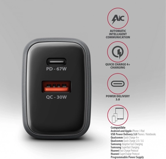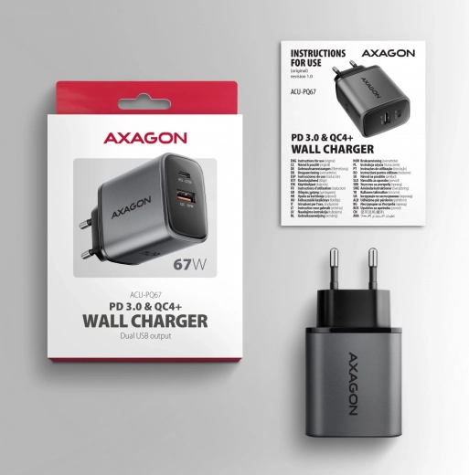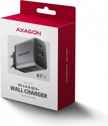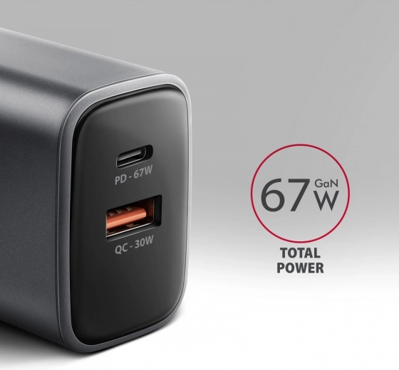 The AXAGON GaN 67W travel charger quickly charges up to two devices at the same time. Thanks to GaN technology, support for USB Power Delivery 3.0 and Quick Charge 4+, it can power laptops, phones, and tablets at top speed. Its compact body, USB‑C PD 67W and USB‑A QC 30W make it an ideal choice for home, office, and travel.