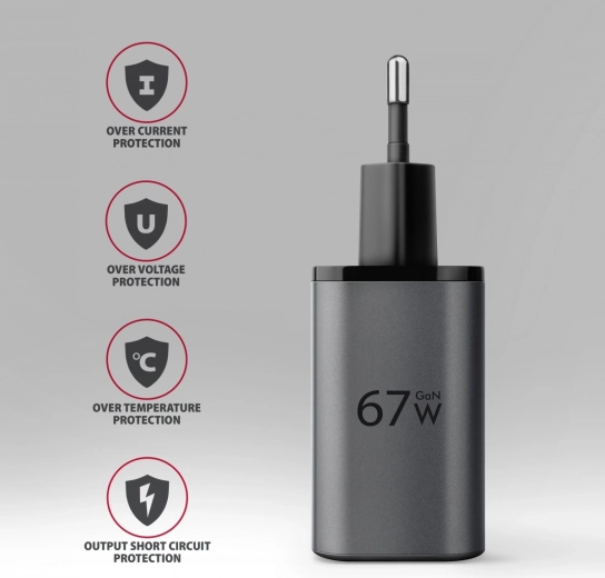 - Fast charging of phones, tablets, and laptops up to 67 W